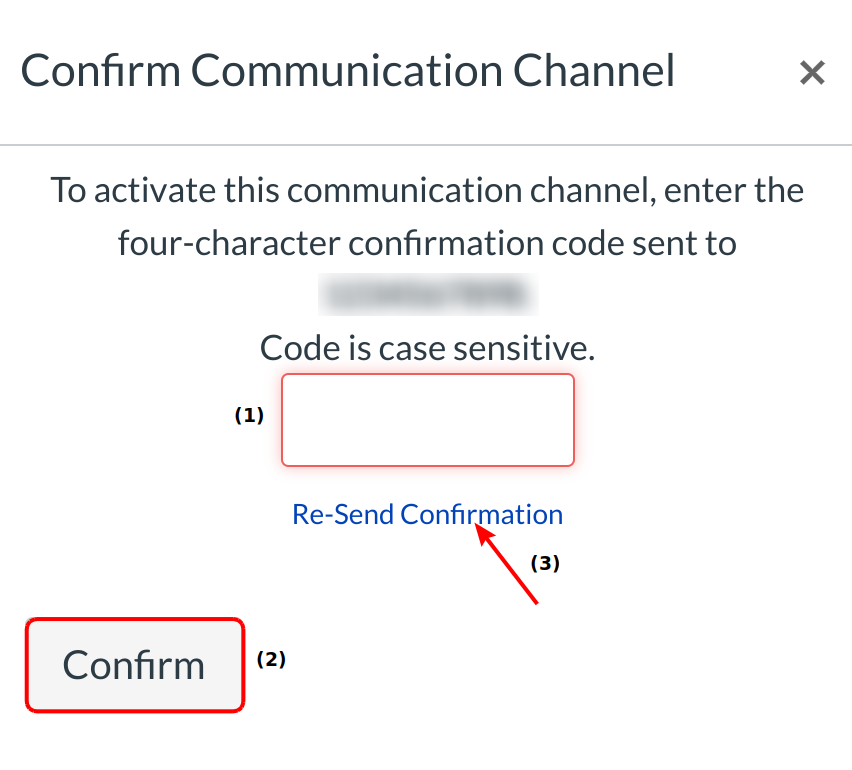You will receive a text message on your cell phone with an activation code. Enter the code into the text field [1] and click the Confirm button [2]. Click the Re-Send Confirmation link to receive the confirmation code again [3].