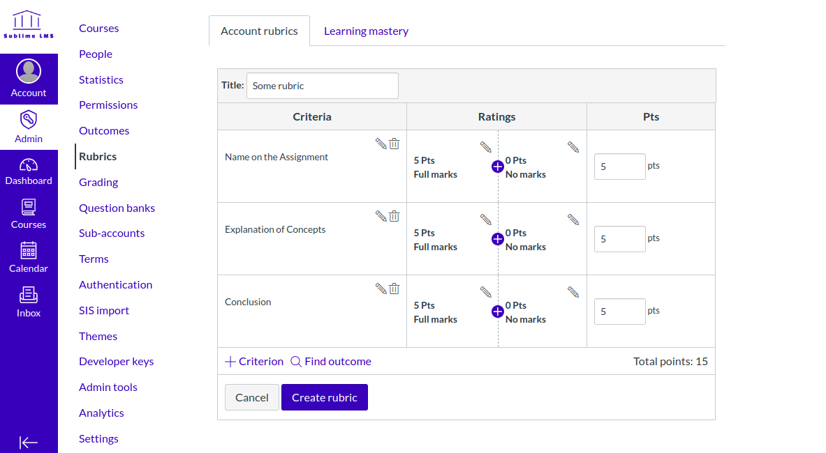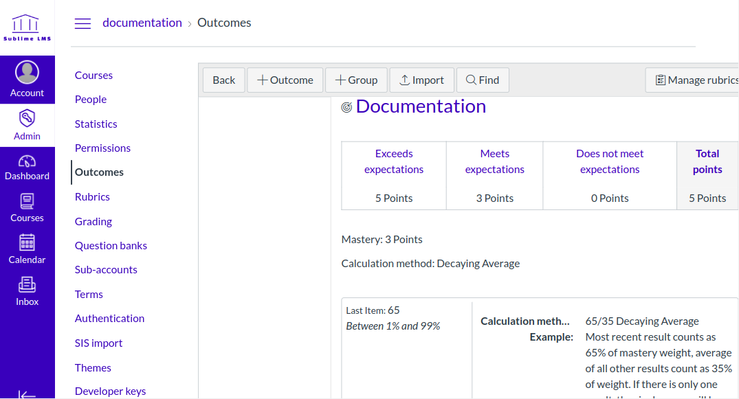 Learning outcomes are the specific intentions of course. You can set up custom or Outcome-based criteria for grading. Outcomes describe what a student should know, understand, or be able to do at the end of a course. They are statements of the things students can reasonably expect to know or be able to do by the end of course.
