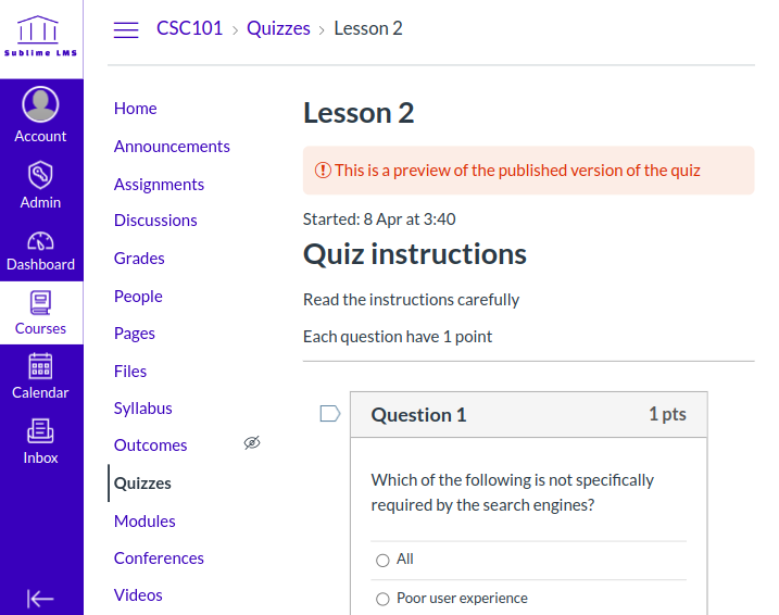 Create quizzes by importing questions from the existing Question Banks. Give your students the opportunity to re-take the tests. Allow unlimited test attempts or set a maximum attempt limit. Give your students the feedback about their answers by adding comments to each answer.