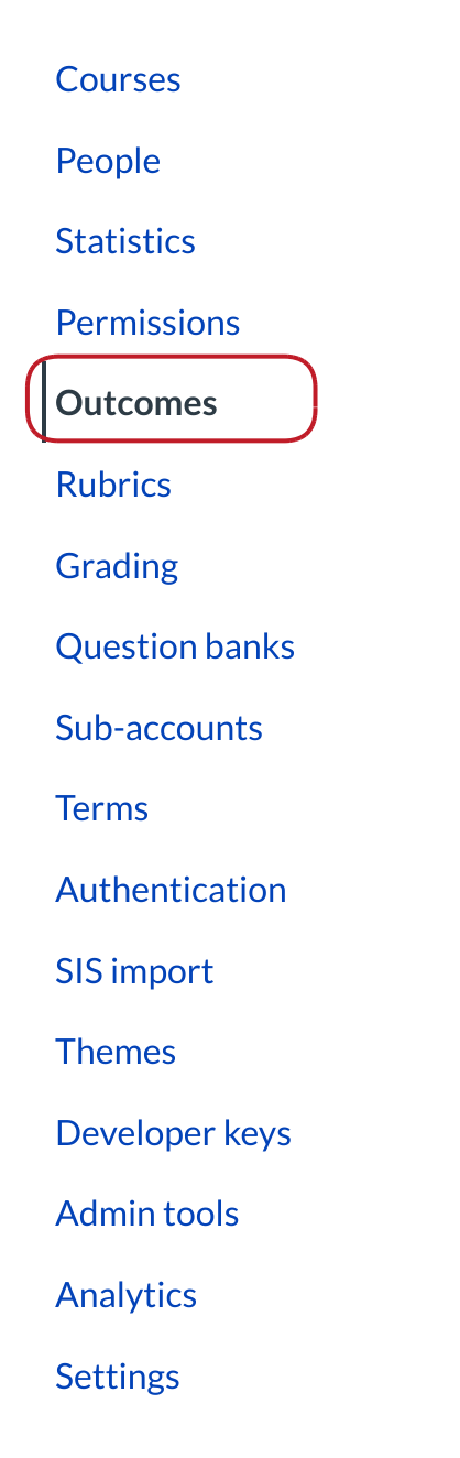 Outcomes can be created from the account, sub-account, or course-level. You can create nested outcomes, or import State or Common Core Standards into your account, sub-account, or course.
