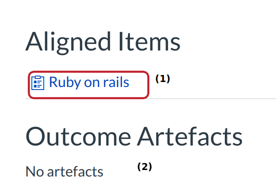 View the assessments and activities aligned to the Outcome [1]. View the progress of individual candidates on each artifact (the aligned assessment or activity) [2].