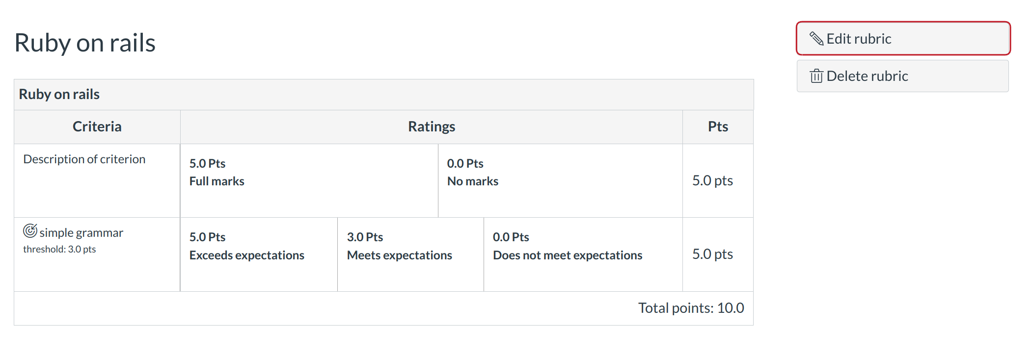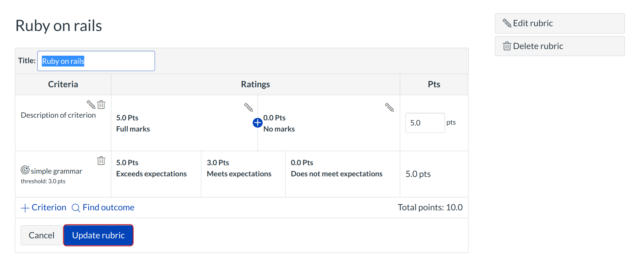 You can Edit the Rubric Title, Criteria, Ratings, and Points details.