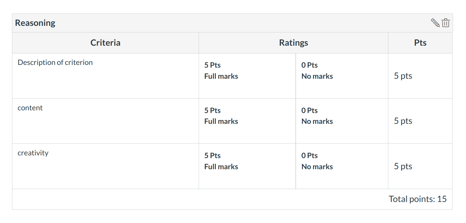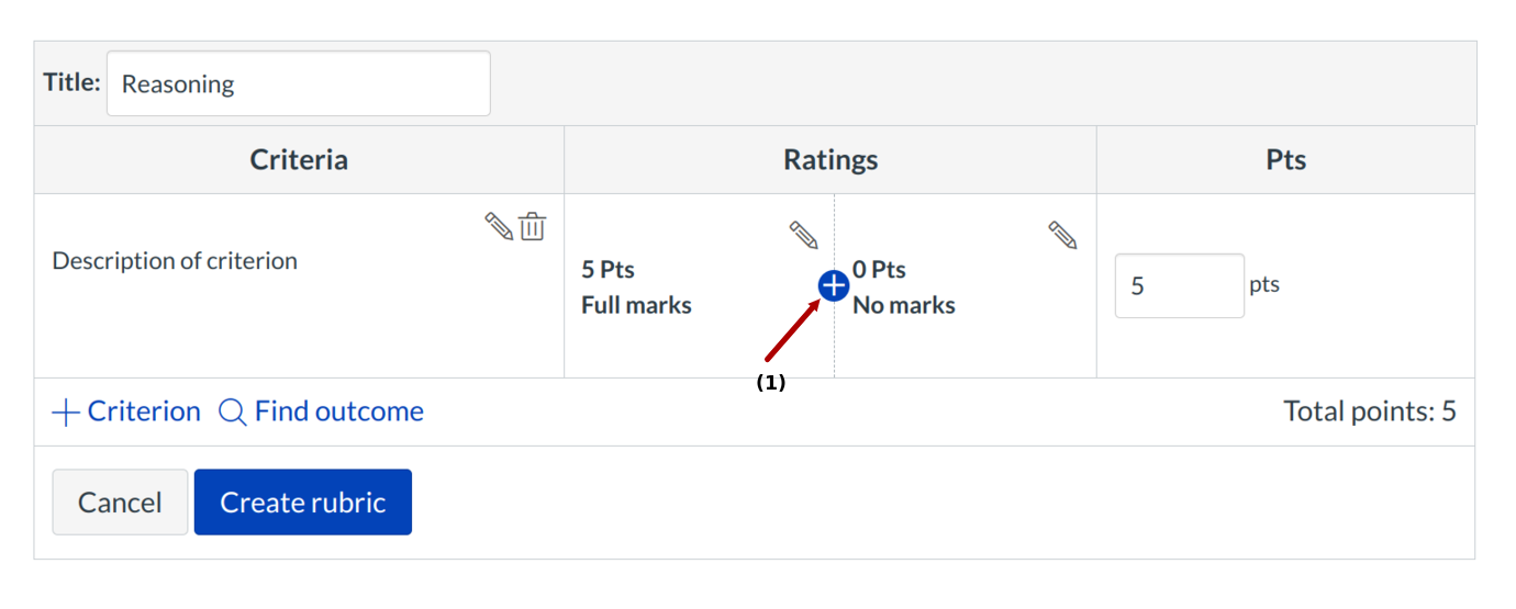 Hover over the rubric rating you wish to edit. Click the Pencil icon [1] to edit the rubric rating.
