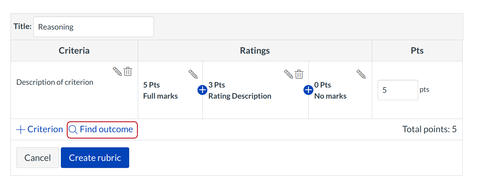 Click the Find Outcome Criterion link to align course or account level outcomes with the rubric.