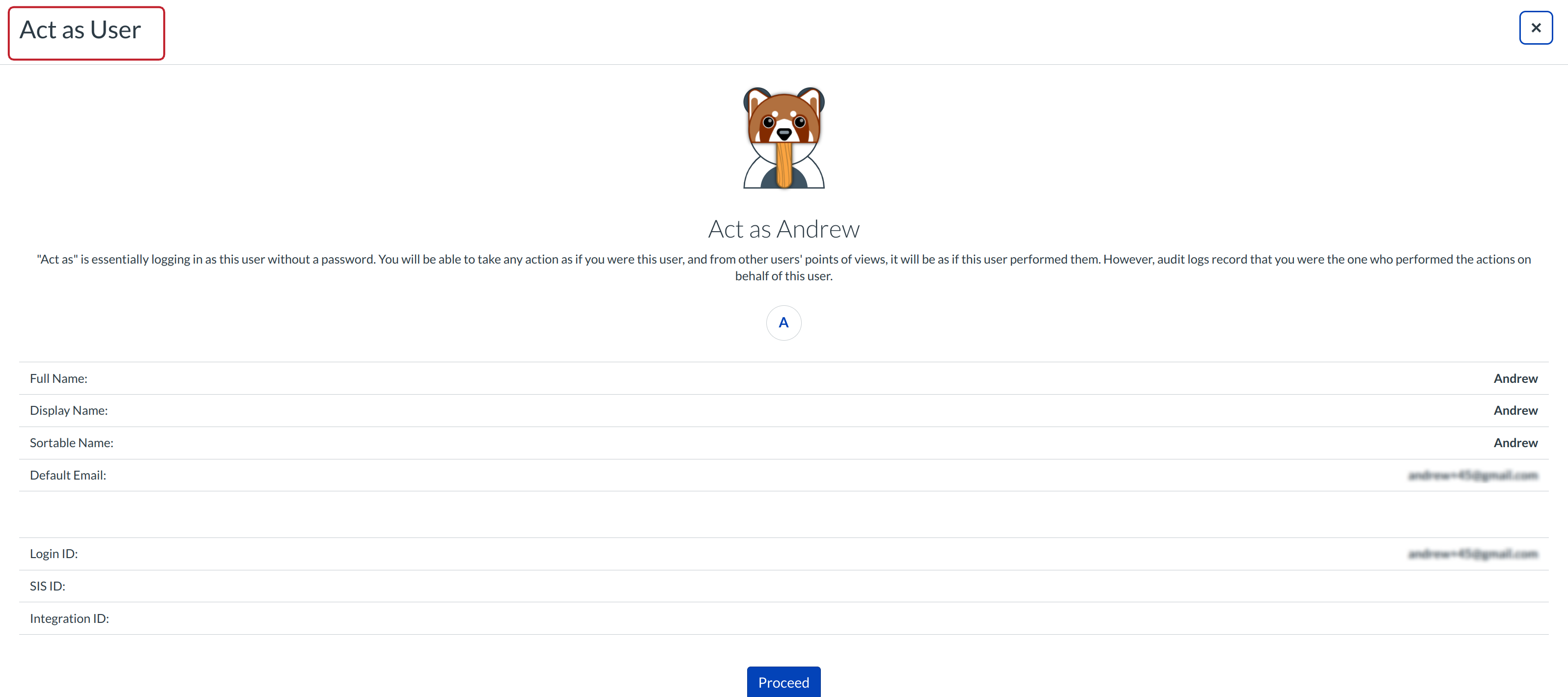 After clicking the Act as user link, you will be directed to a screen that will ask if you want to act as this user. Click the Proceed button to act as the user.
