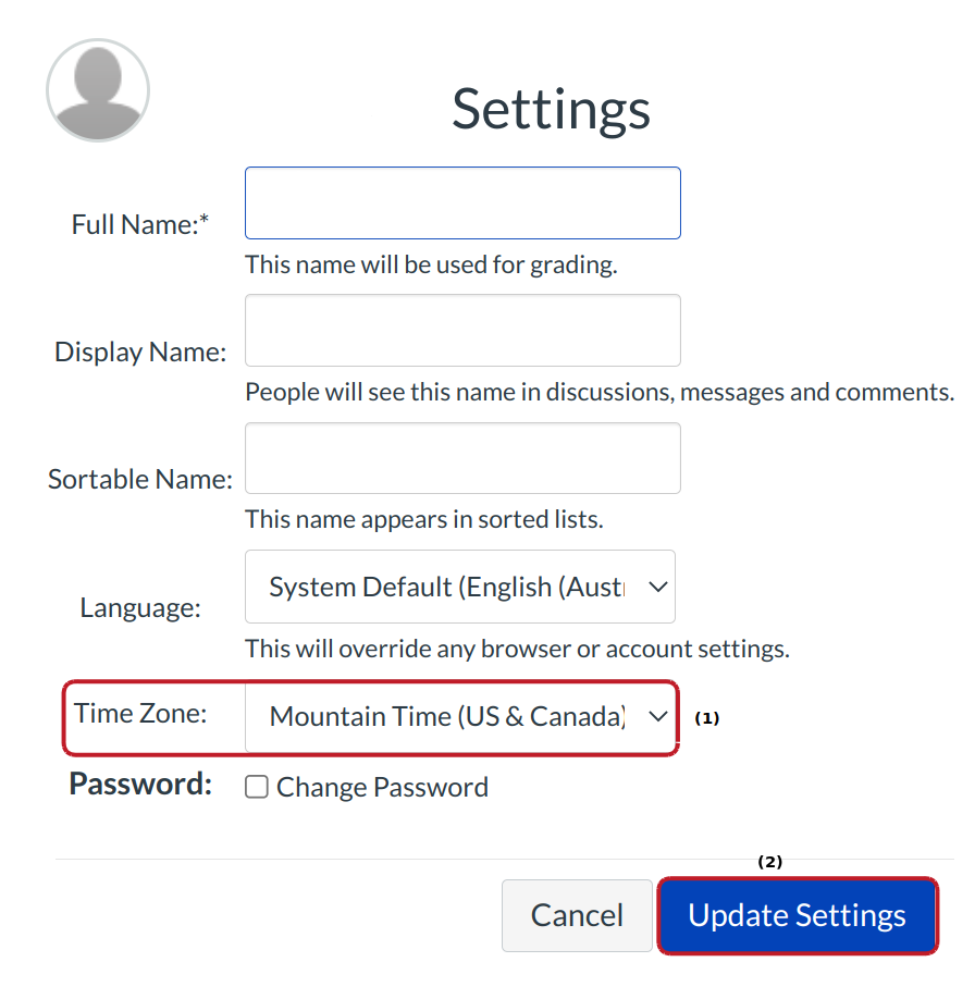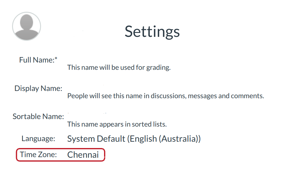 Note: If you set a time zone in your user settings, you can always view the course time zone by hovering over any date and time in your course. The text will show both the local time and course time.