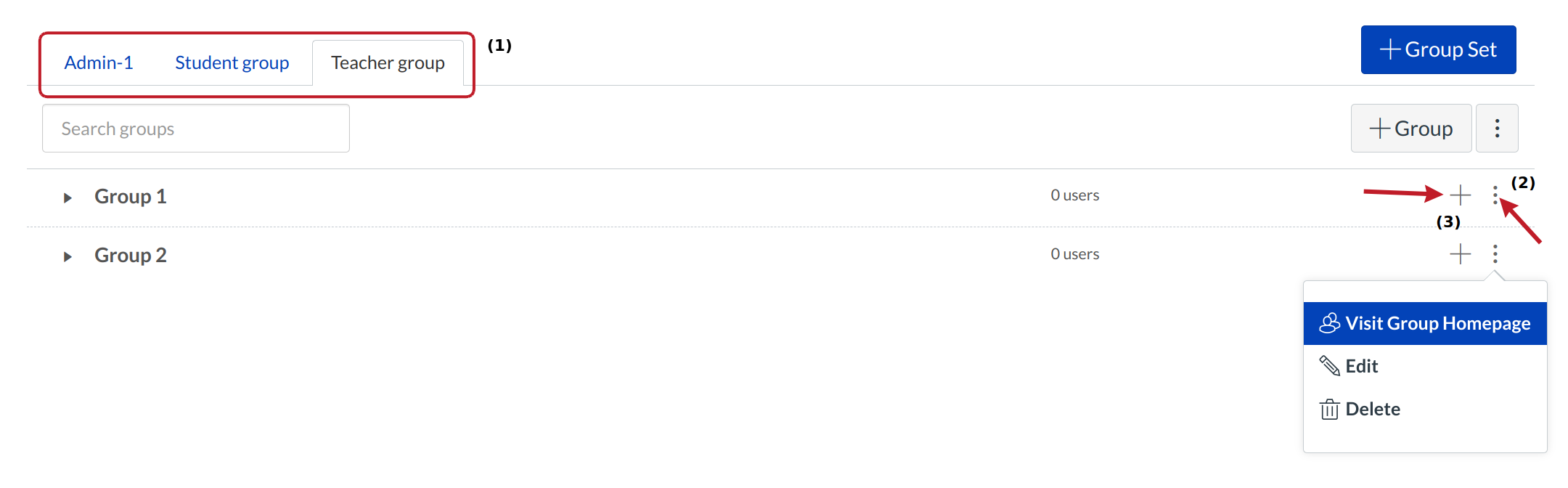 View the different types of Groups (Admin- 1, Teacher group, and student group) [1]. Click the three vertical dots icon to Visit Group Homepage [2]. Click the + icon [3] to search and add users to groups.