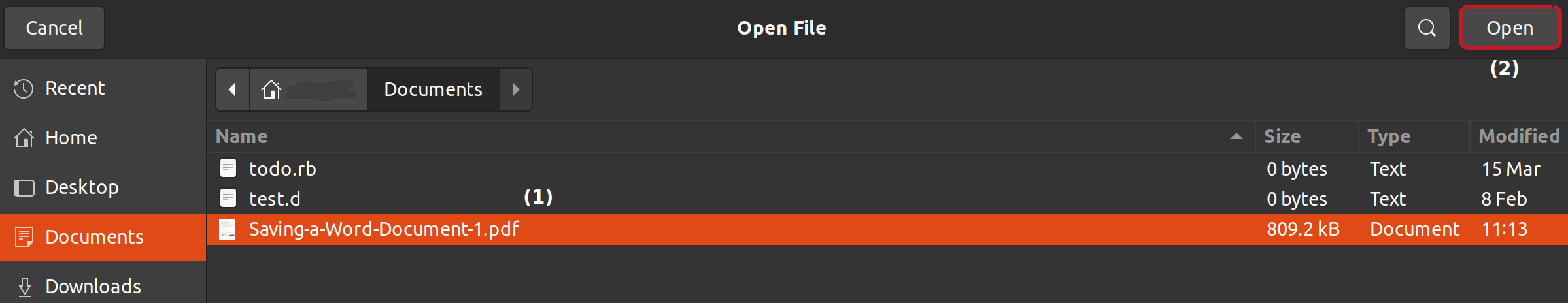 Choose the file you want to attach [1]. Click the Open button to attach the file to the Announcement [2].
