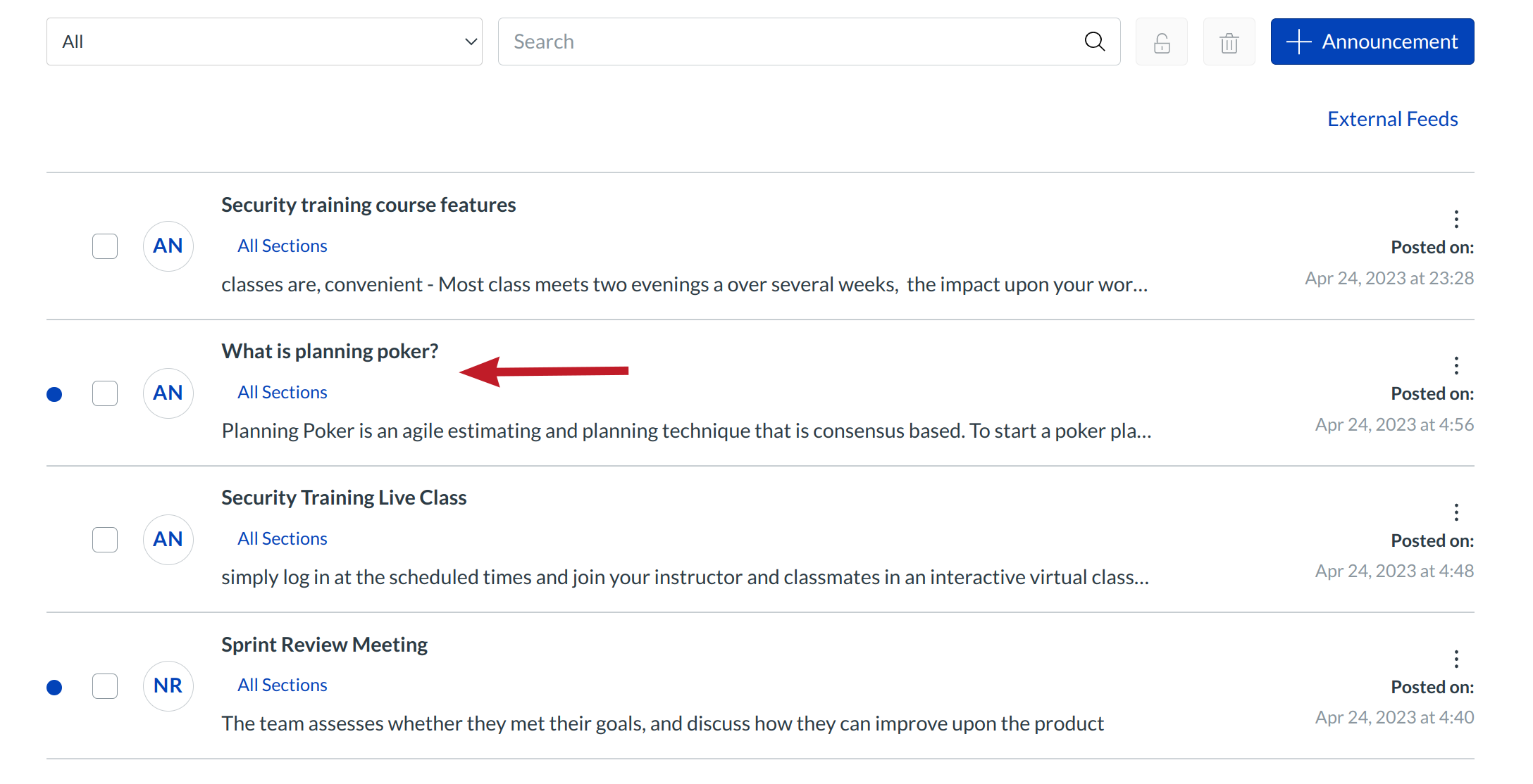Click the announcement title to open the announcement.