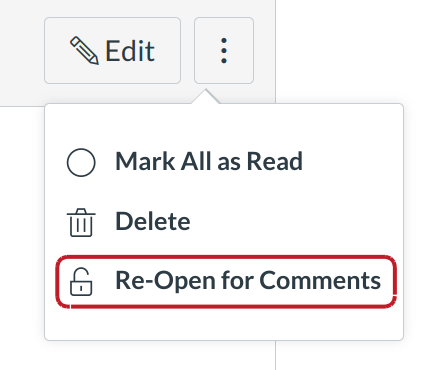 Locate the Settings icon and click the Re-Open for Comments link to re-open the announcement for comments.