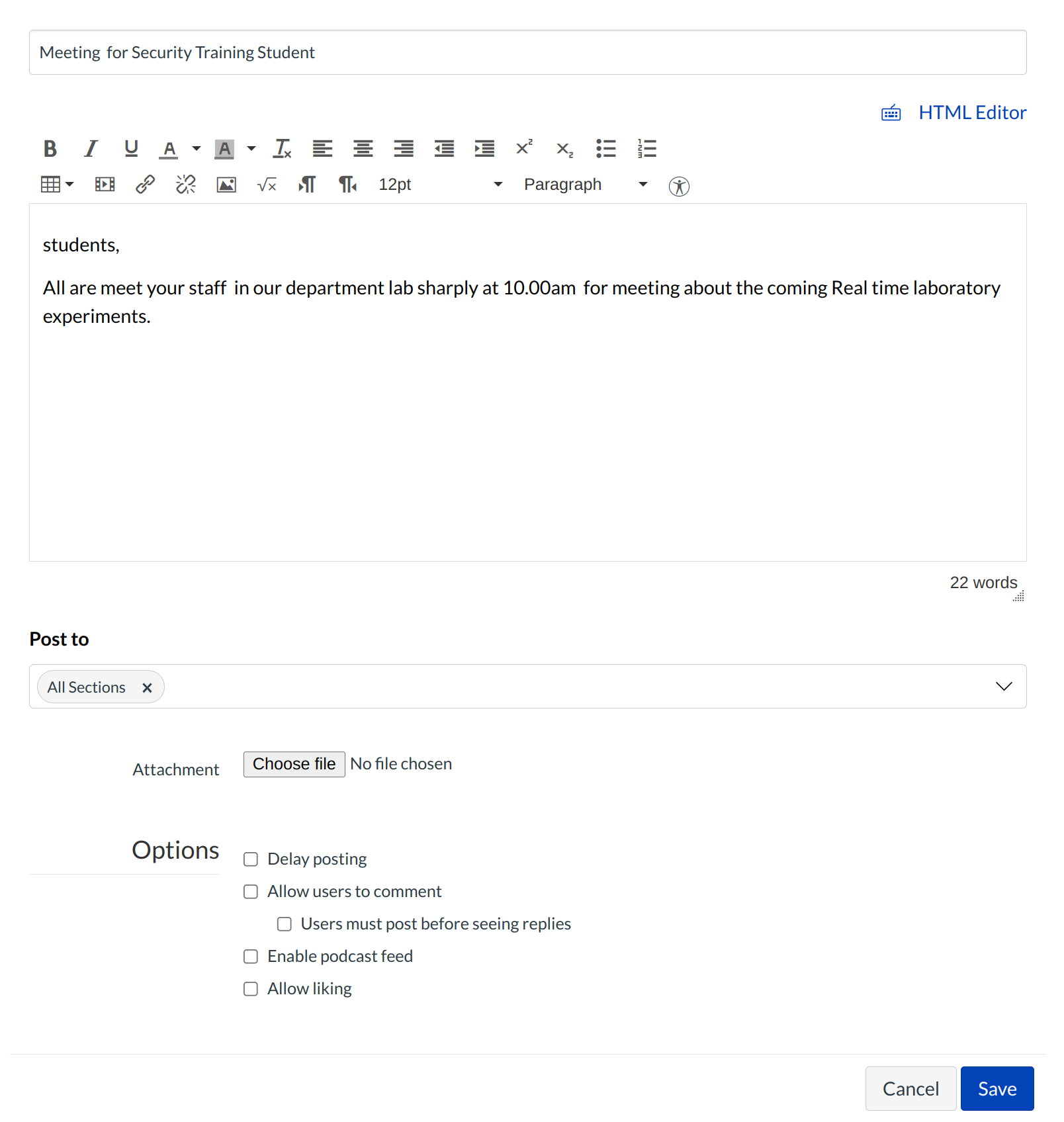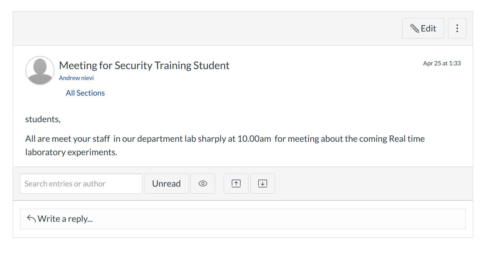 Note: Editing an announcement will create a notification on the Global Dashboard and Course Activity Stream.