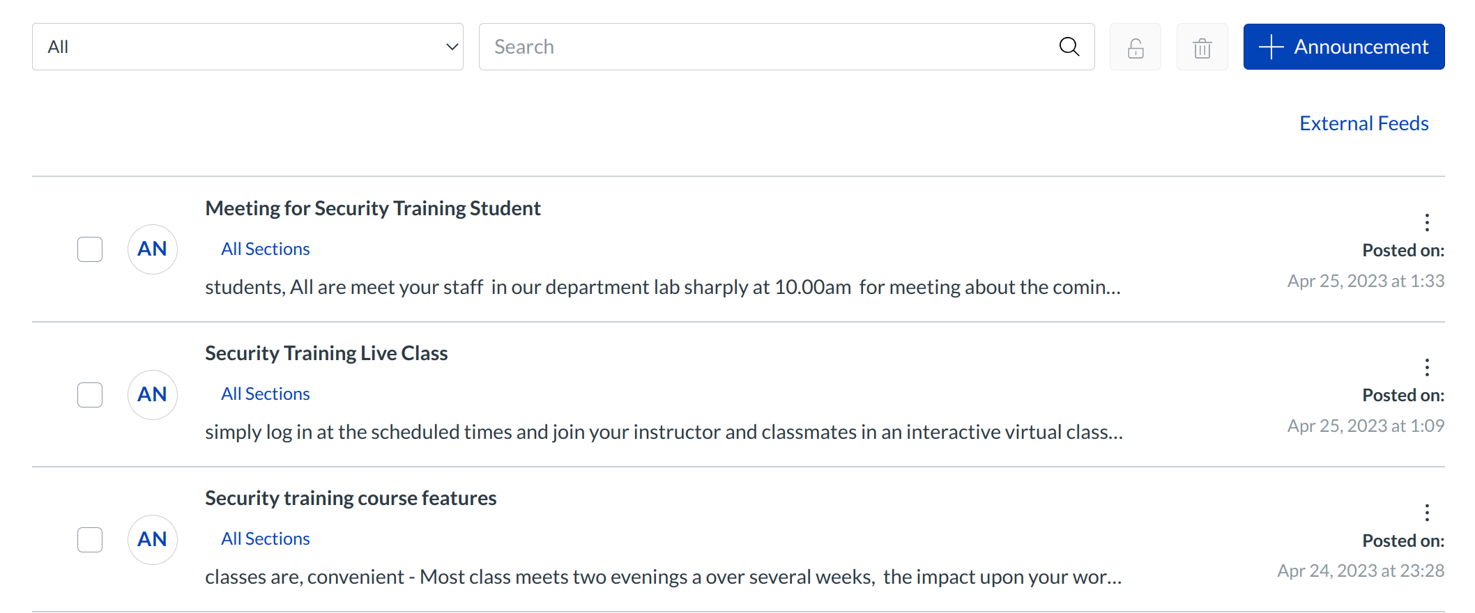 Announcements allow you to communicate with your students about course activities and post interesting course-related topics.