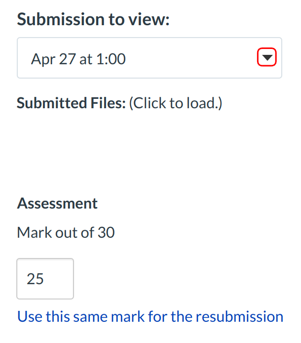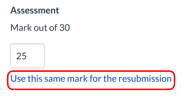 If you have already graded an assignment that a student has resubmitted, you have the option of using the same grade for the resubmission without doing any additional work. To apply the same grade to the new assignment, click the Use this same grade for the resubmission link.