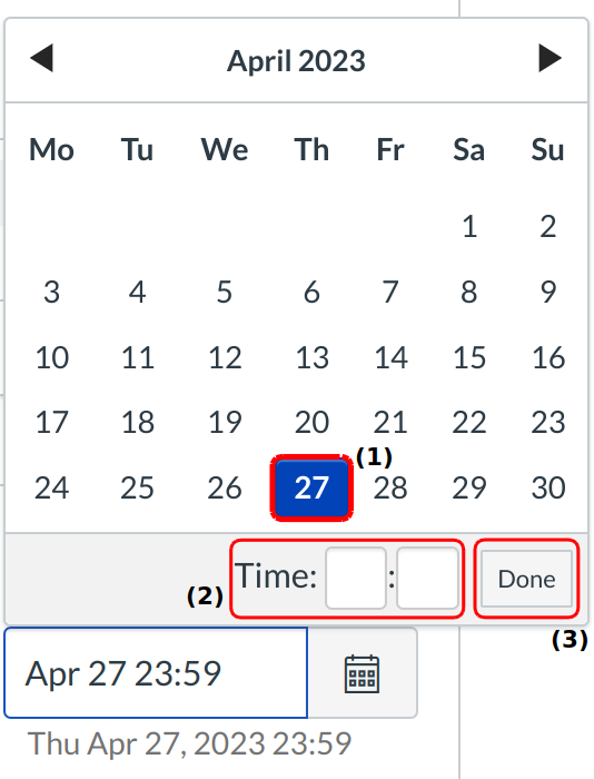 Set the date and time the assignment availability date by selecting a date [1] and time [2]. Click the Done button to save your changes [3].