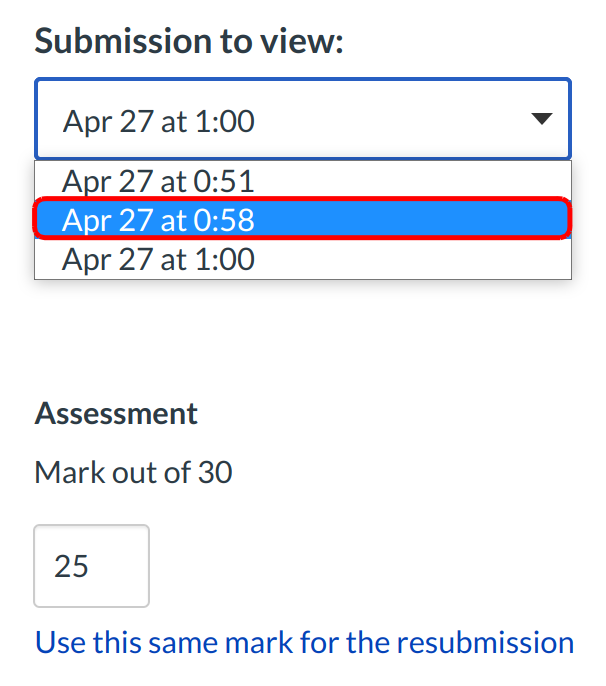 Open the student's Assignment in Grading Tool. When a student has submitted multiple submissions, you can view them by clicking the drop-down button.