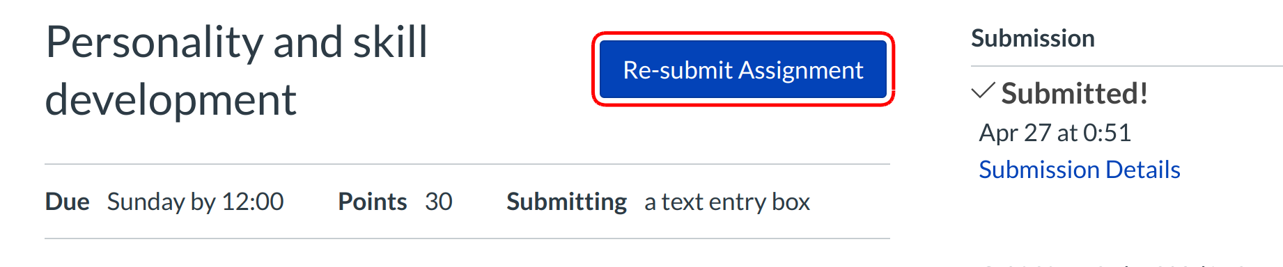 Students will see a Re-submit Assignment link in the Sidebar below the Assignment submission details.