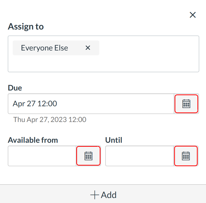 If you want to keep students from resubmitting assignments after a certain date, you can change the Assignment availability dates. Next to the date you want to change, choose the Calendar icon.