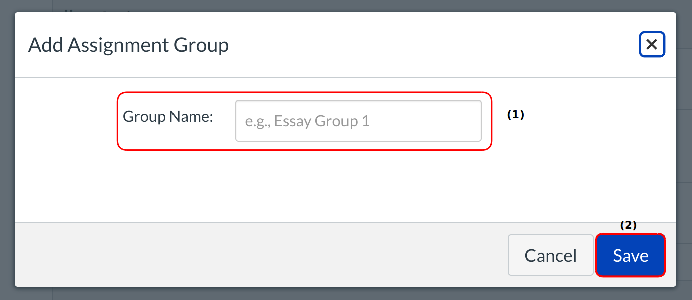 Type the Assignment Group title in the Group Name field [1]. Click the Save button [2] to create the Assignment Group.