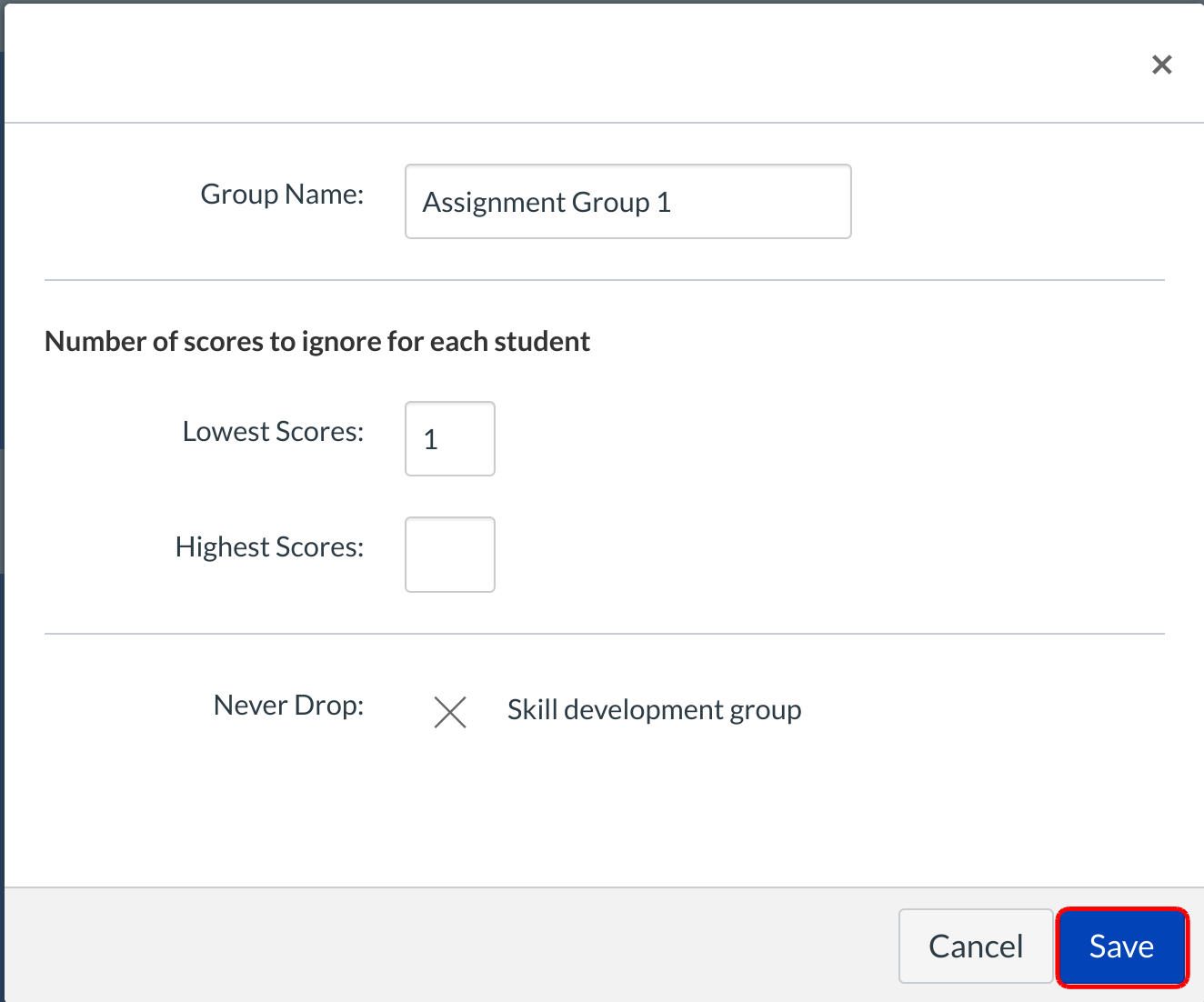 For each Assignment Group, you can Drop the lowest or Drop the Highest x number of grades. You can also specify which Assignments should never be dropped from the Assignment Group calculation and click Save button for apply changes.