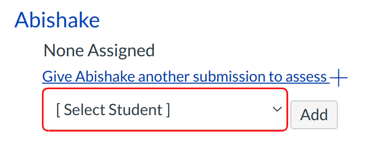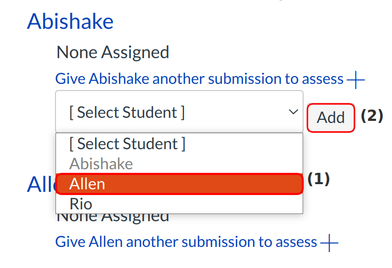 Select the peer you would like the student to review [1]. Remember, a student can not review themselves. Click the Add button [2] to assign the review.