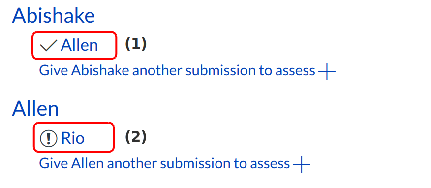 Assigned peer reviews appear underneath the students name. A checkmark [1] indicates a peer review as been completed. A caution circle [2] indicates a peer review still needs to be completed.