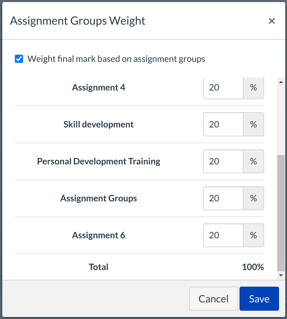 Enter the percentage weights for each of the different Assignment Groups you created. The percentage weights you specify here will determine how the final grade for your course is calculated. These percentages can be changed at any time and students will be notified when any changes are made. The weights will show up in the Gradebook for both students and instructors.