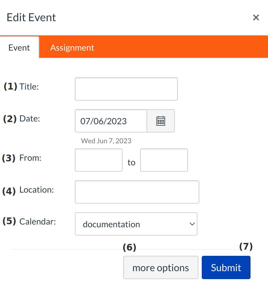 Enter a title for the event [1]. The date will already be entered, but you can change it if you like [2]. Specify the start and end time for your event [3]. Enter the location of event held [4]. Make sure that the correct course is selected in the Calendar drop down [5]. Click More Options to link to files or other resources related to the event [6]. Click the Submit button [7].