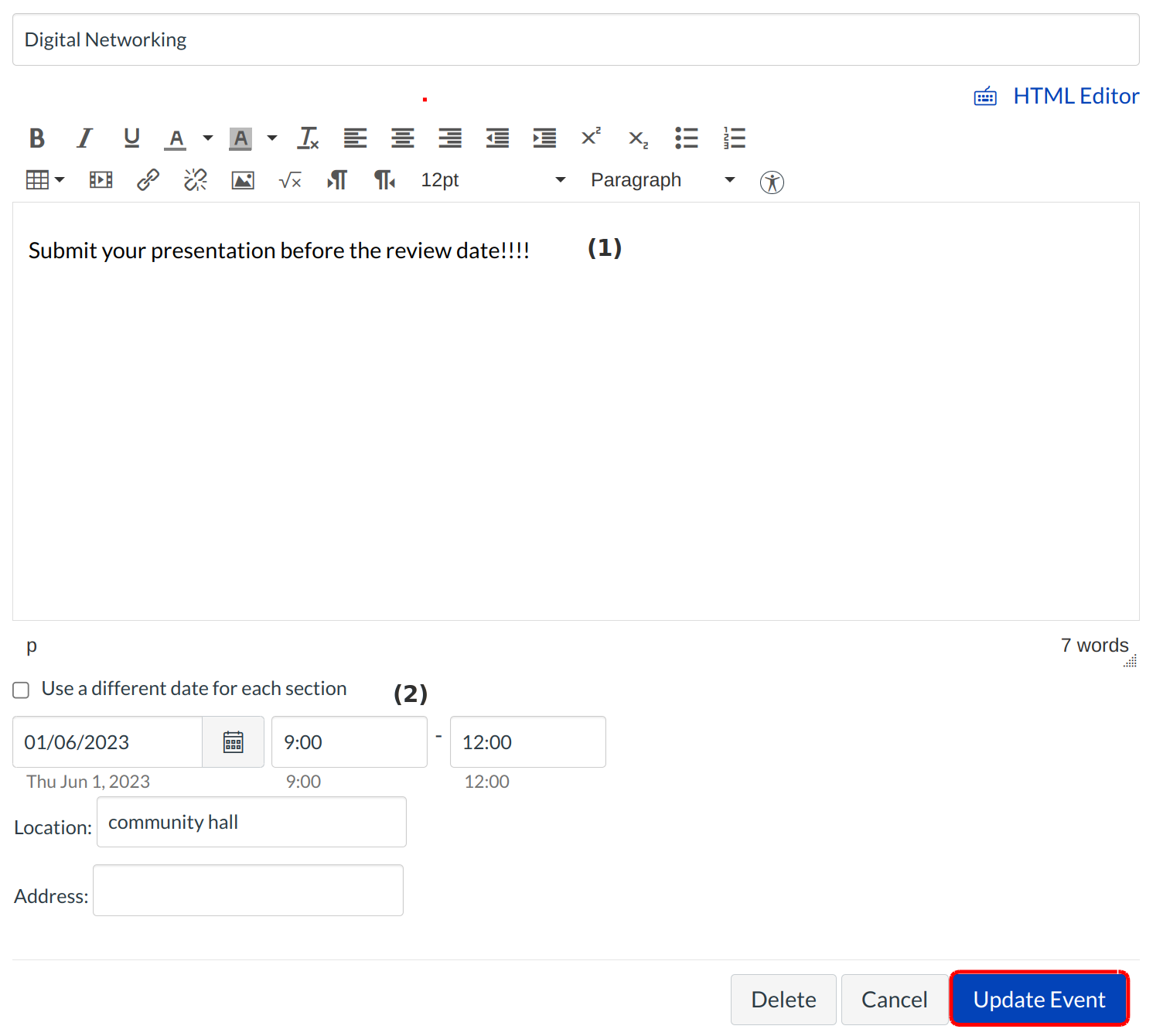 You can also use a different date for each section in your course by selecting the Use a different date for each section checkbox [2]. Click Update Event to save changes.