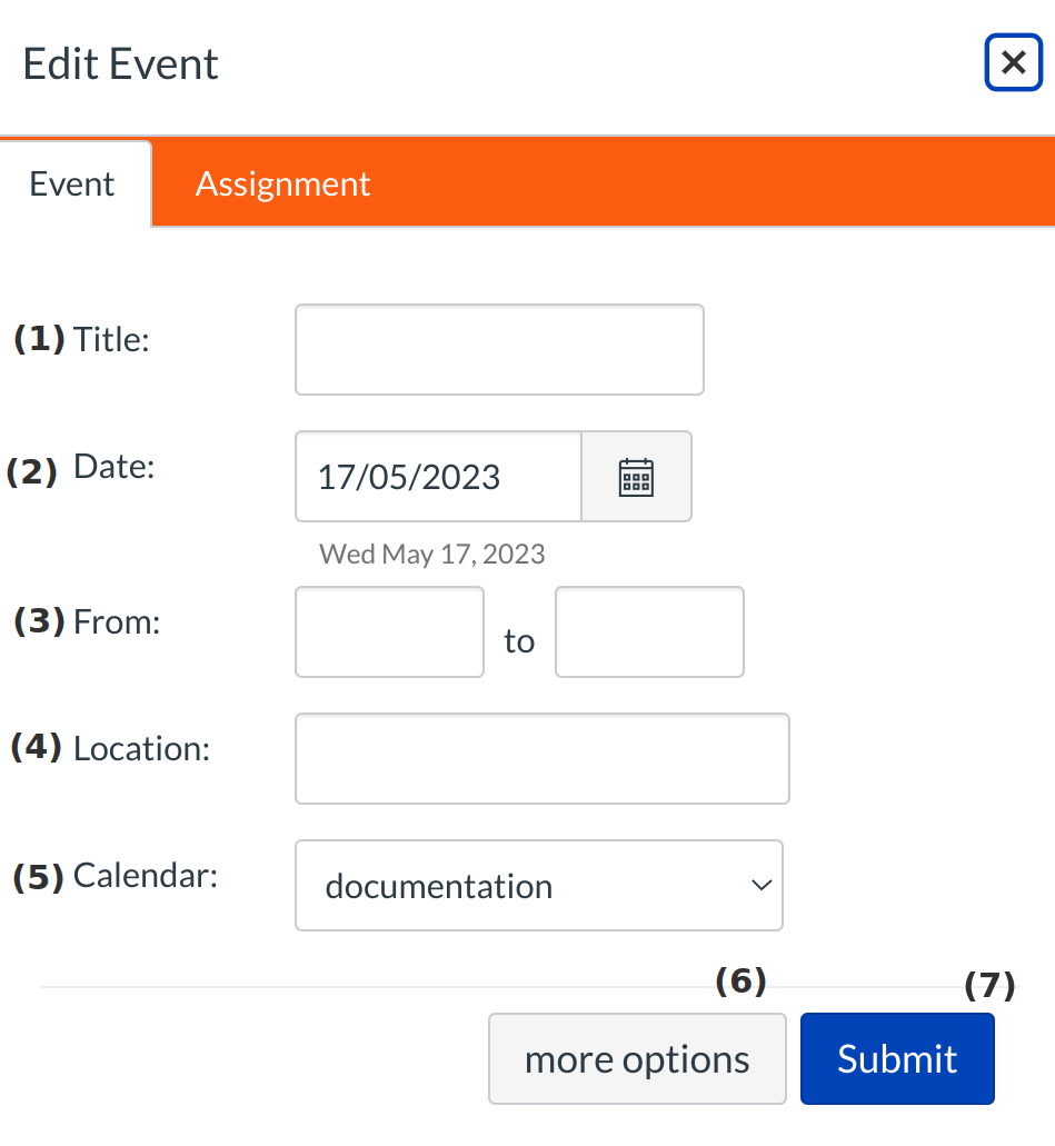 Enter a title for the event [1]. The date will already be entered, but you can change it if you like [2]. Specify the start and end time for your event [3]. Mention the Location of the event [4]. Make sure that the correct course is selected in the Calendar drop down [5]. Click the More Options button to link to files or other resources related to the event [6]. Click Submit [7].