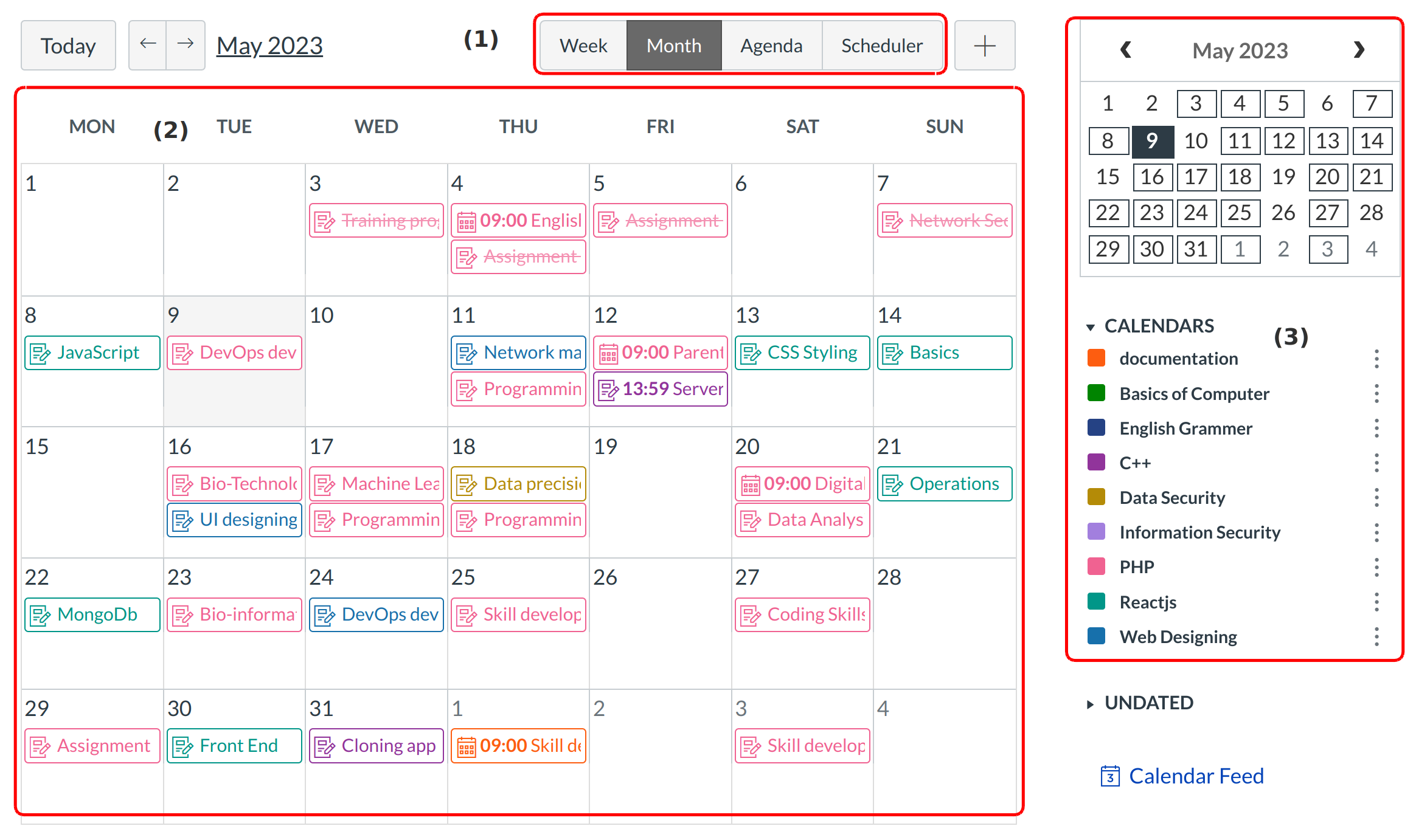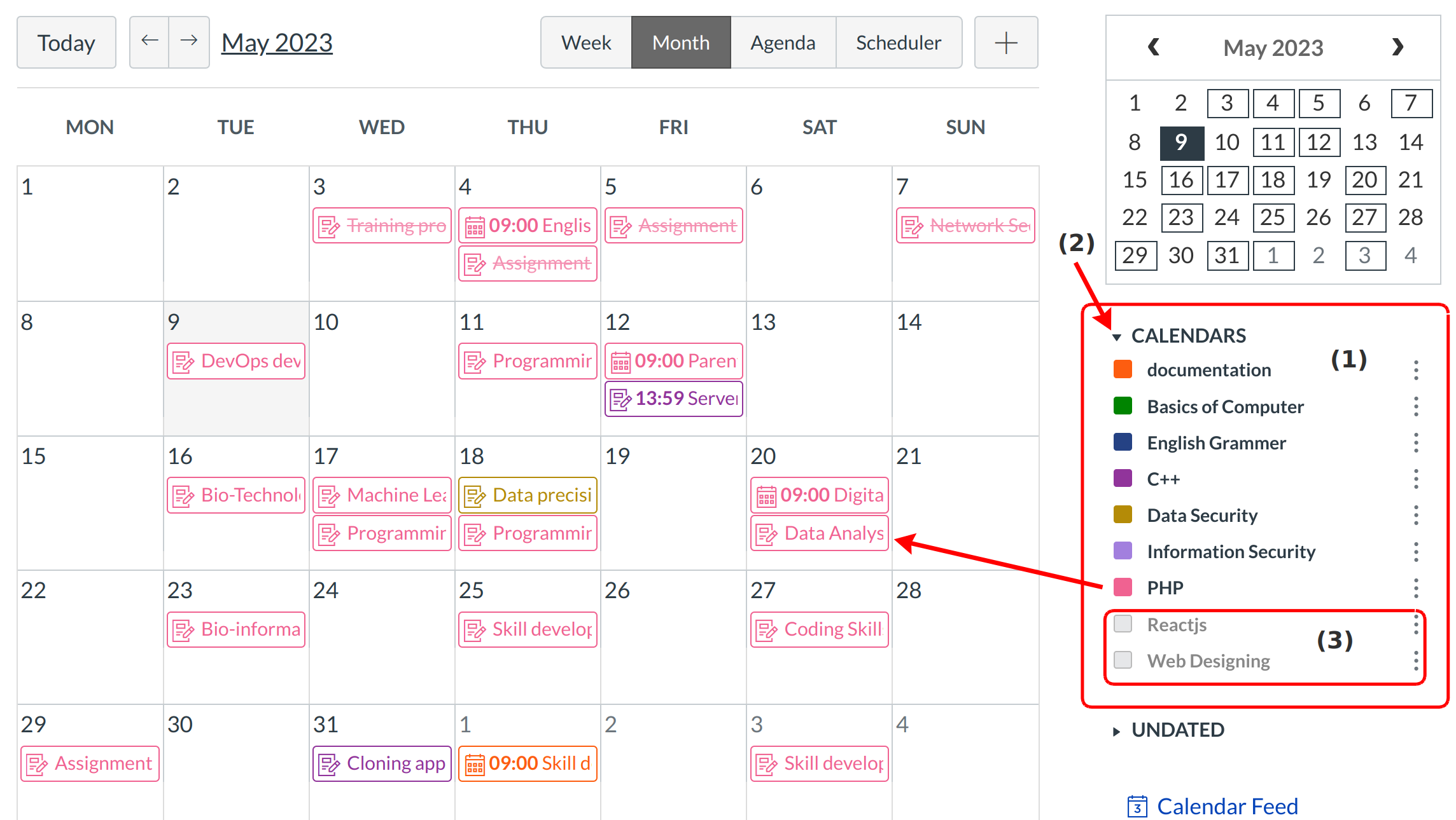 By default, all your course calendars and group calendars will be selected and appear in the calendar view [1]. To hide a calendar, click the down arrow mark next to the name of the calendar [2]. Calendars that are not active within the calendar view will appear in gray [3].