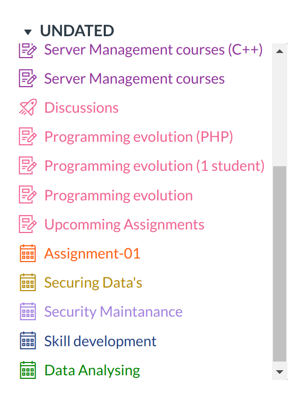 Expanding the Undated events link will show you a list of events and assignments that are not dated. The assignments and events will be differentiated by icons and by the personal, course, or group calendar color.