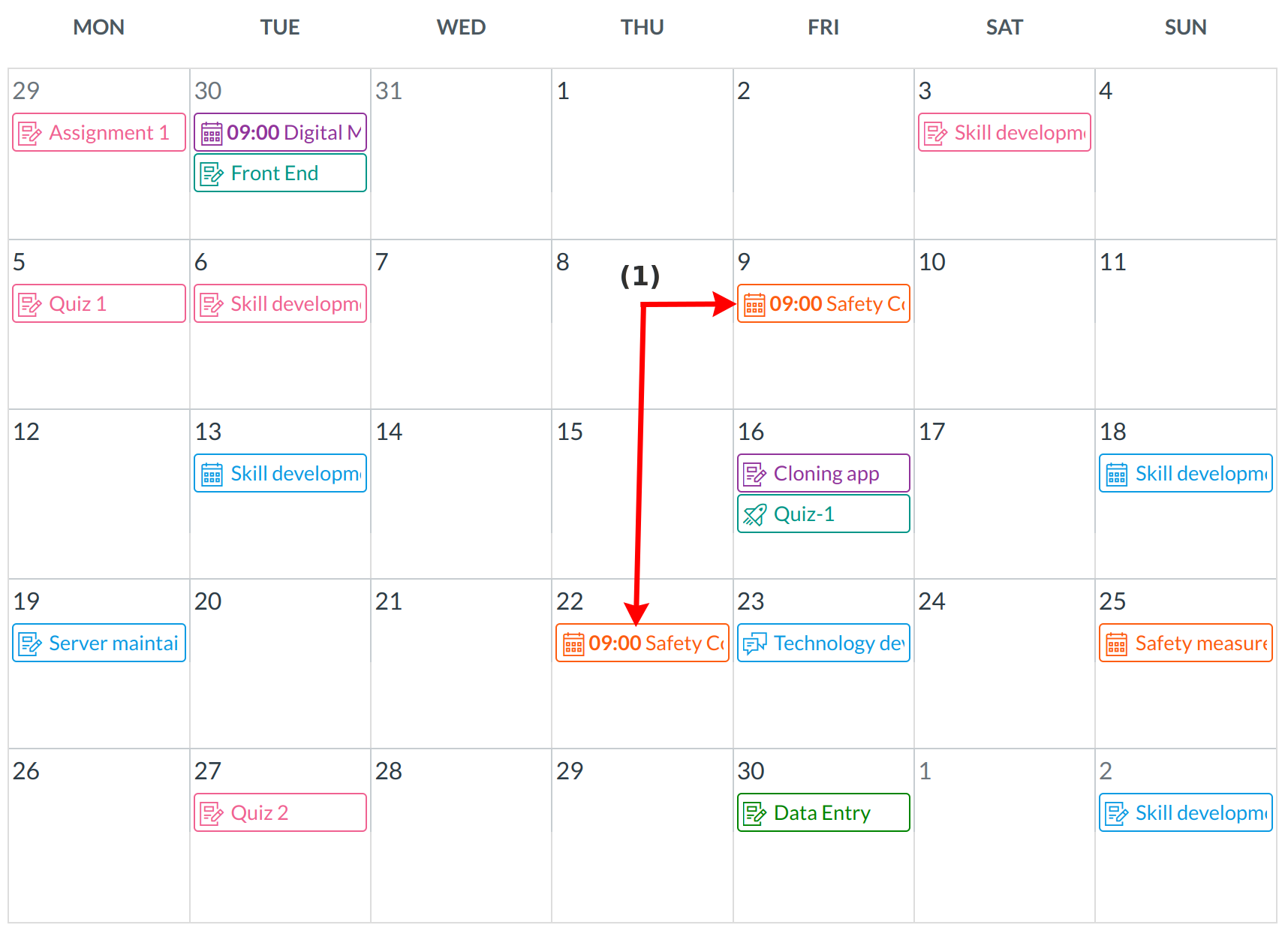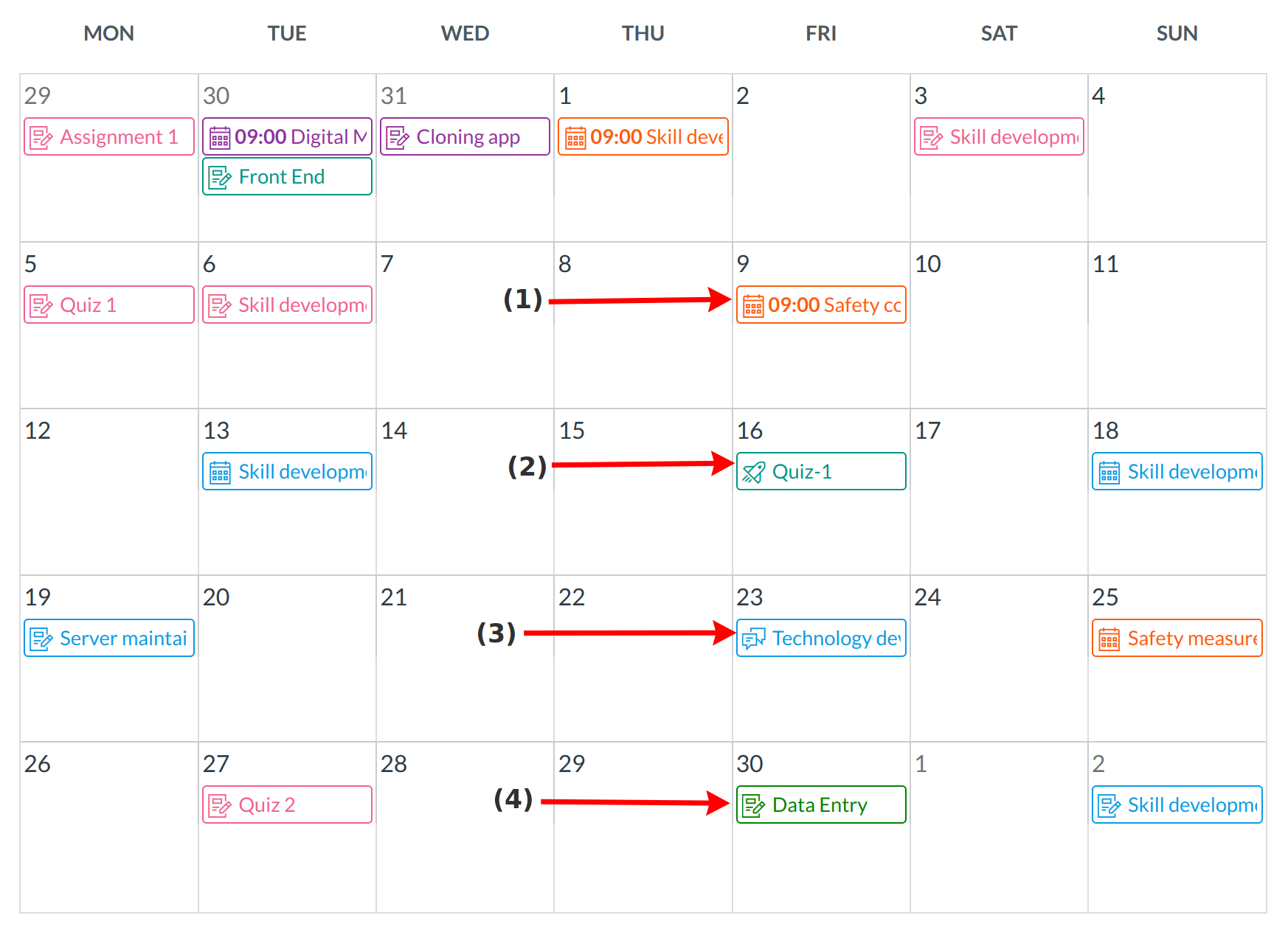 Assignments are shown with an icon next to the assignment title. The icon reflects the assignment type: Events [1], Quiz [2], Discussion [3], or Assignment [4].