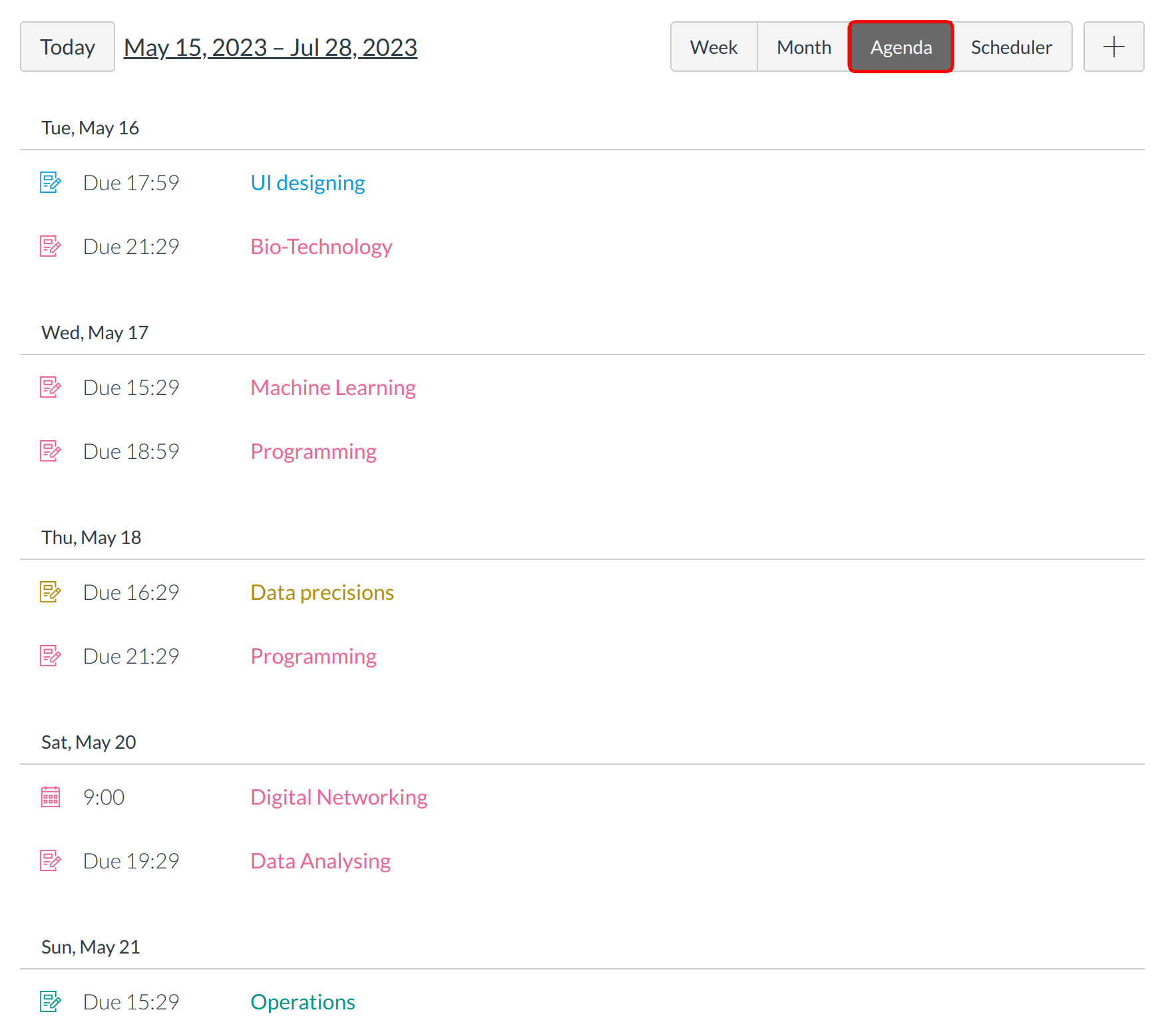 Each personal, course, and group calendar is identified by a separate color that populates the calendar view. Associated assignments for each course or group will appear within the calendar view for each calendar. For instance, in the above example, assignments and events from the PHP course will appear as Pink in the calendar view.