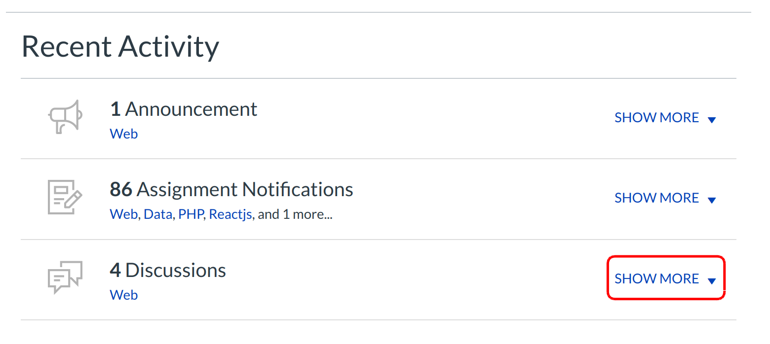 The Global Stream contains a stream of recent activity from all of your courses. There are announcements, discussions, assignment, notifications, and conversations. This activity stream helps students and teachers to stay on top of what is going on in the course and allows them to easily ask questions and post to discussion forums. You can view the details of each section by hovering in the section area and clicking the Show More button.