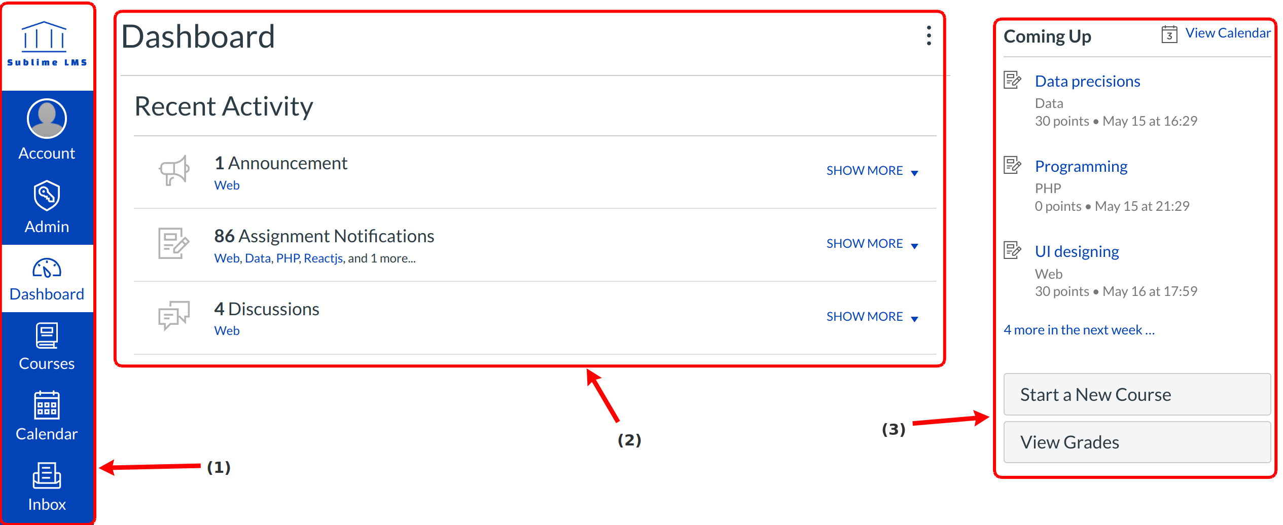 The Dashboard is the first thing you will see when you log into your account. The Dashboard helps you see what is happening in all your courses and allows you to figure out what to do next.