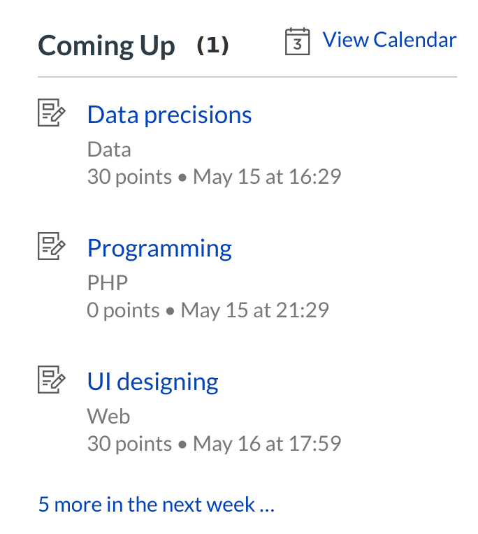 1. The Coming Up feed lists the next three assignments or events coming due in the next week.