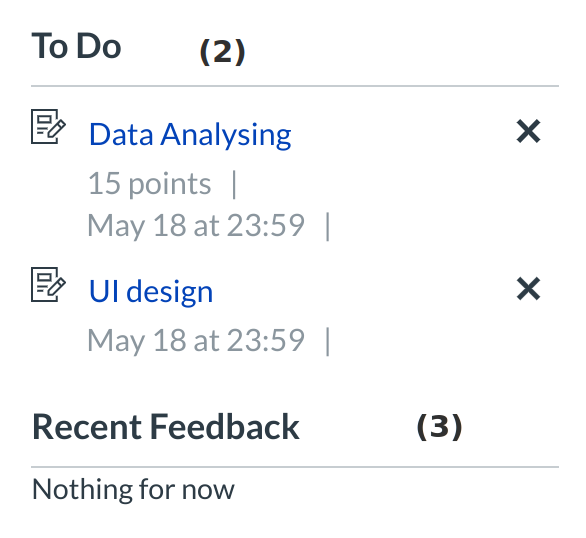2. The To Do feed lists the next five assignments you need to turn in (if you are a student) or need to grade (if you are an instructor). Assignments will still show up in this list even if they are past due. Click the links to go directly to the Assignments page.