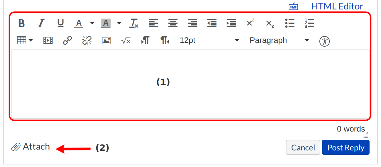 After adding content using the Rich Content Editor to the discussion reply [1], click the Attach button [2].
