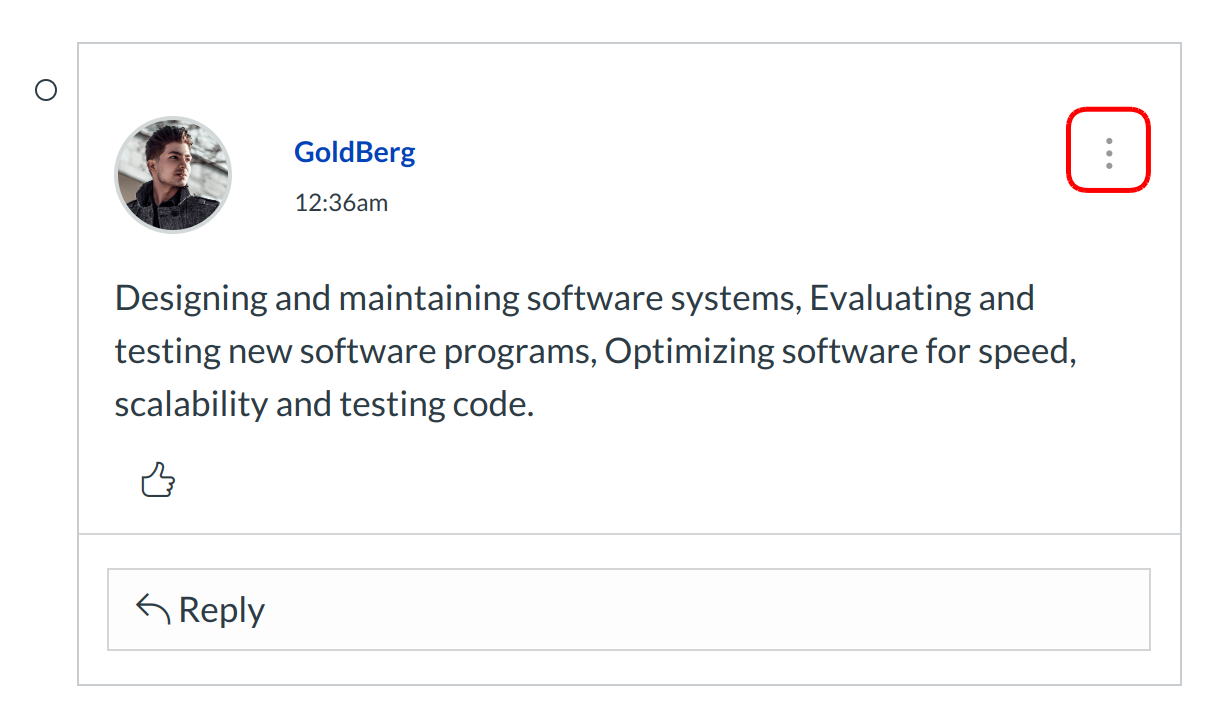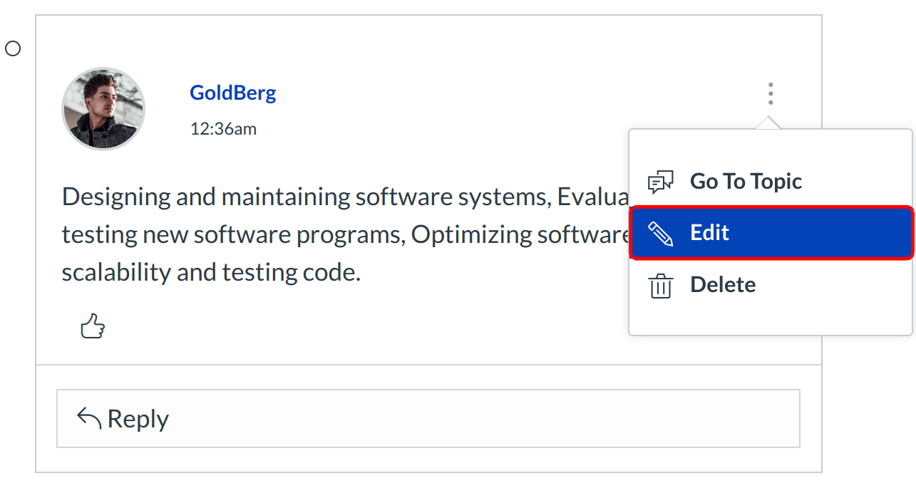 If your instructor allows, you can edit and delete your own Discussion posts. If the edit or delete option does not appear, your instructor has restricted this setting in your course.