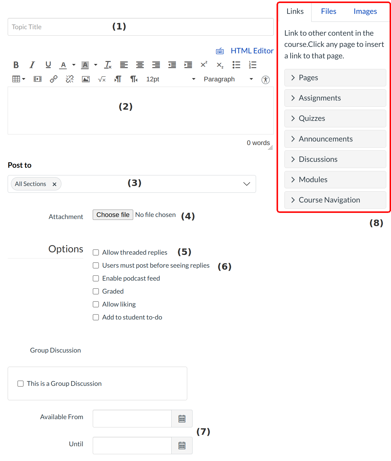 - Set specific dates the discussion can be viewed. Select the date you want the discussion to be show in the Available From field and the date the discussion should be hidden in the Until field. If you do not enter any dates, the discussion will be show during the entire duration of the course.