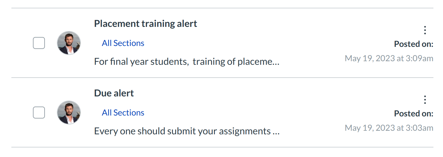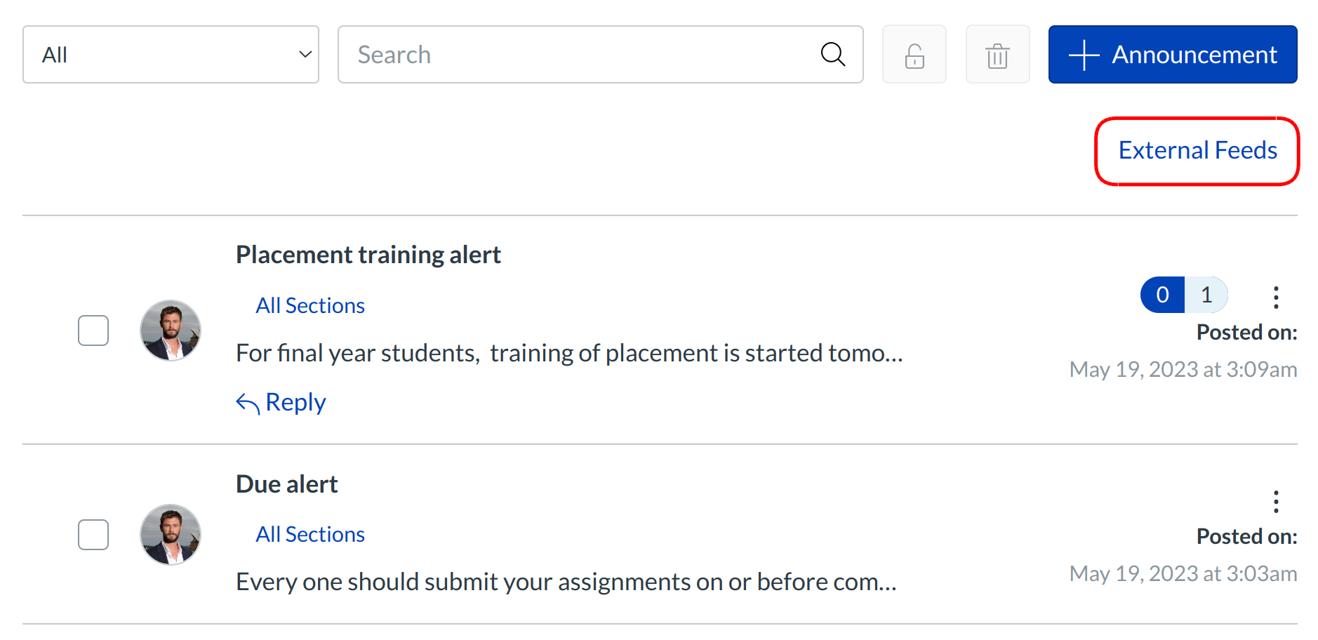 Additionally, students can subscribe to Announcements via any external RSS reader, the RSS Feed is present at the External Feeds. The link to the External feeds is at the top of the Announcements page.