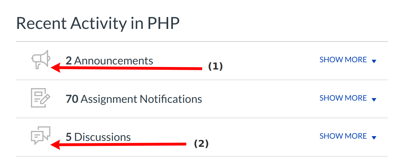 Announcements and Discussions will both appear in the Course Activity Stream and on a user's Dashboard. Announcements are indicated by a megaphone icon [1] and Discussions are indicated by a bubble icon [2]. Next to the icon, Sublime LMS ™ will display the number of Announcements or Discussions, along with a link to the course(s) where the new Announcement or Discussion has been posted.