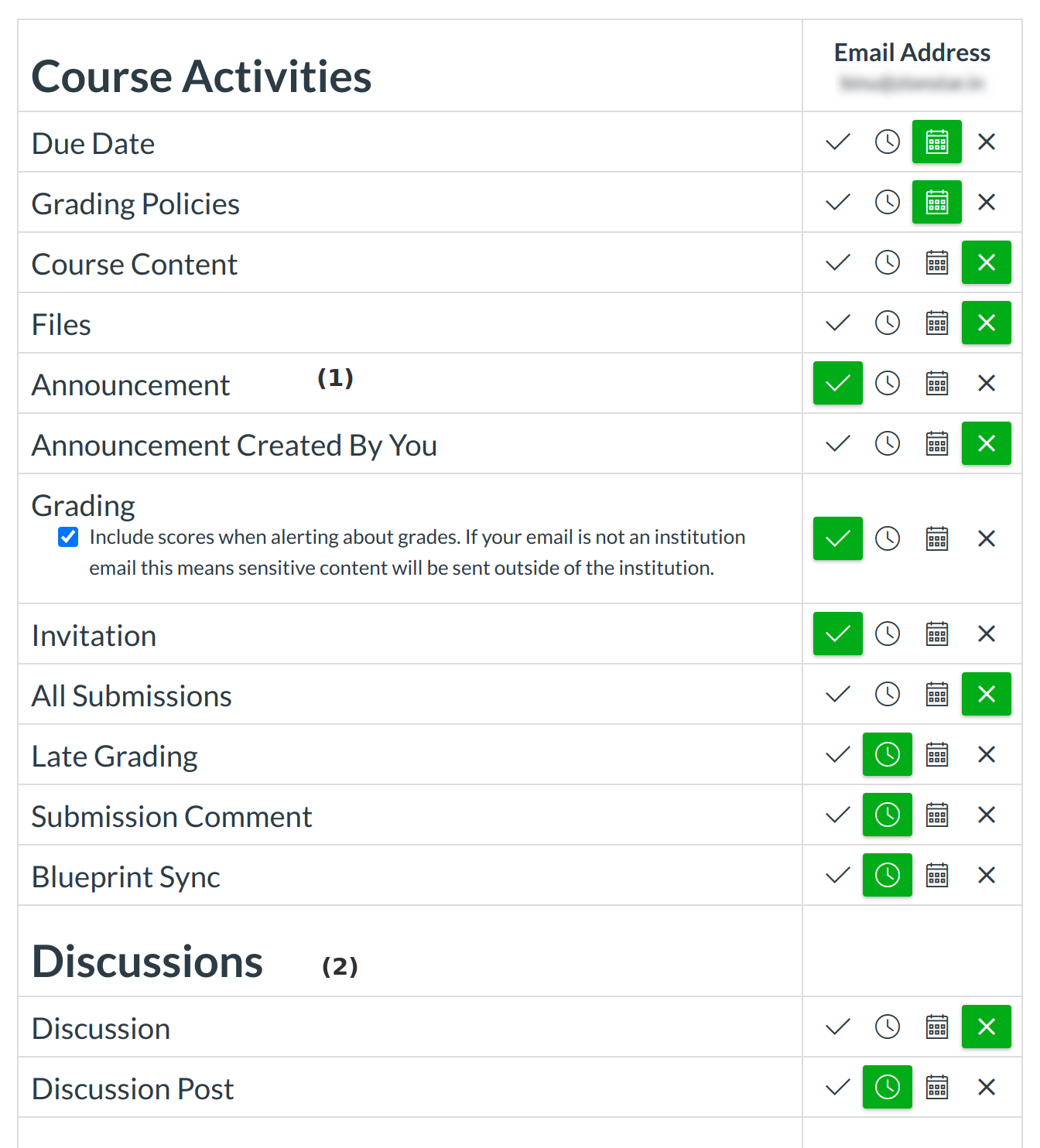 You can set separate notification preferences for Announcements [1] and Discussions [2]. They can be sent to a student's cell phone, email account, Twitter, or Facebook at different points during the day, week, or month.