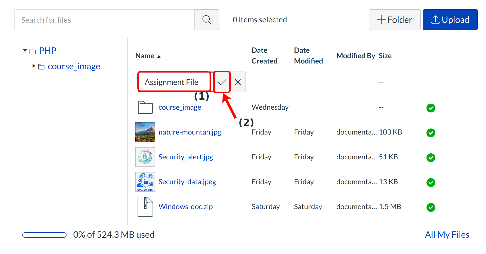 Type the name of the folder in the folder name field [1] and click the tick mark icon [2] or press Return (on a MAC keyboard ) or Enter (on a PC keyboard).