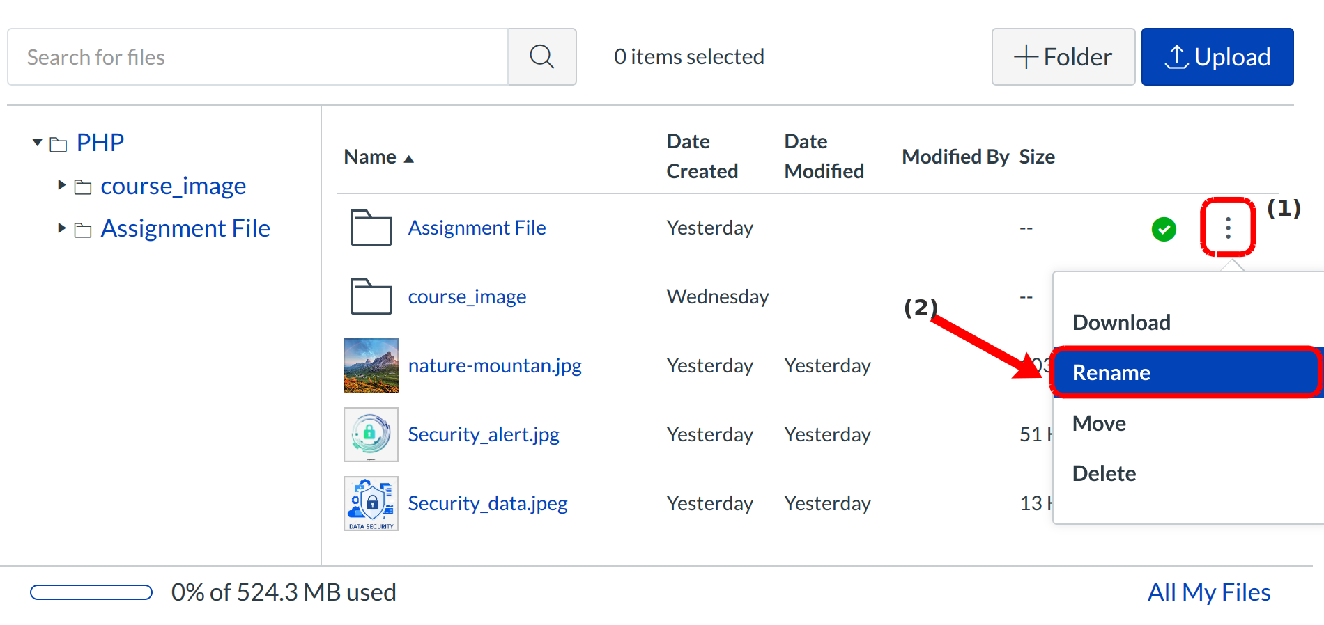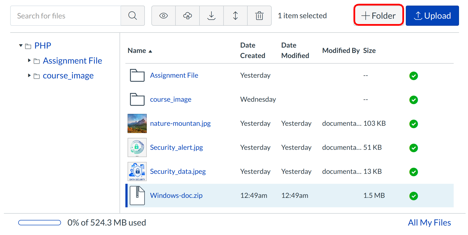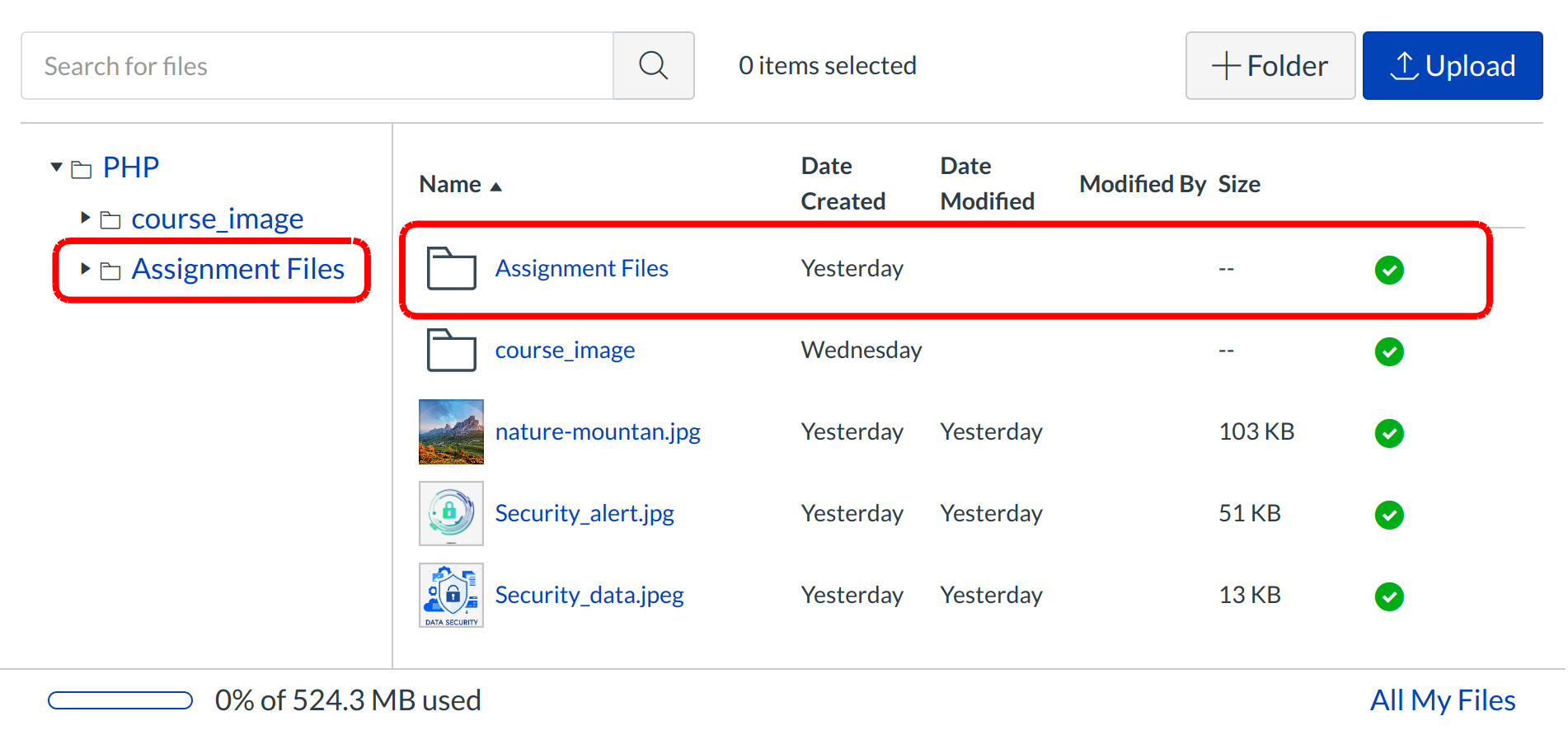 Your folder will appear in both panes of the Files view. You can organize your files on LMS by moving them to folders.