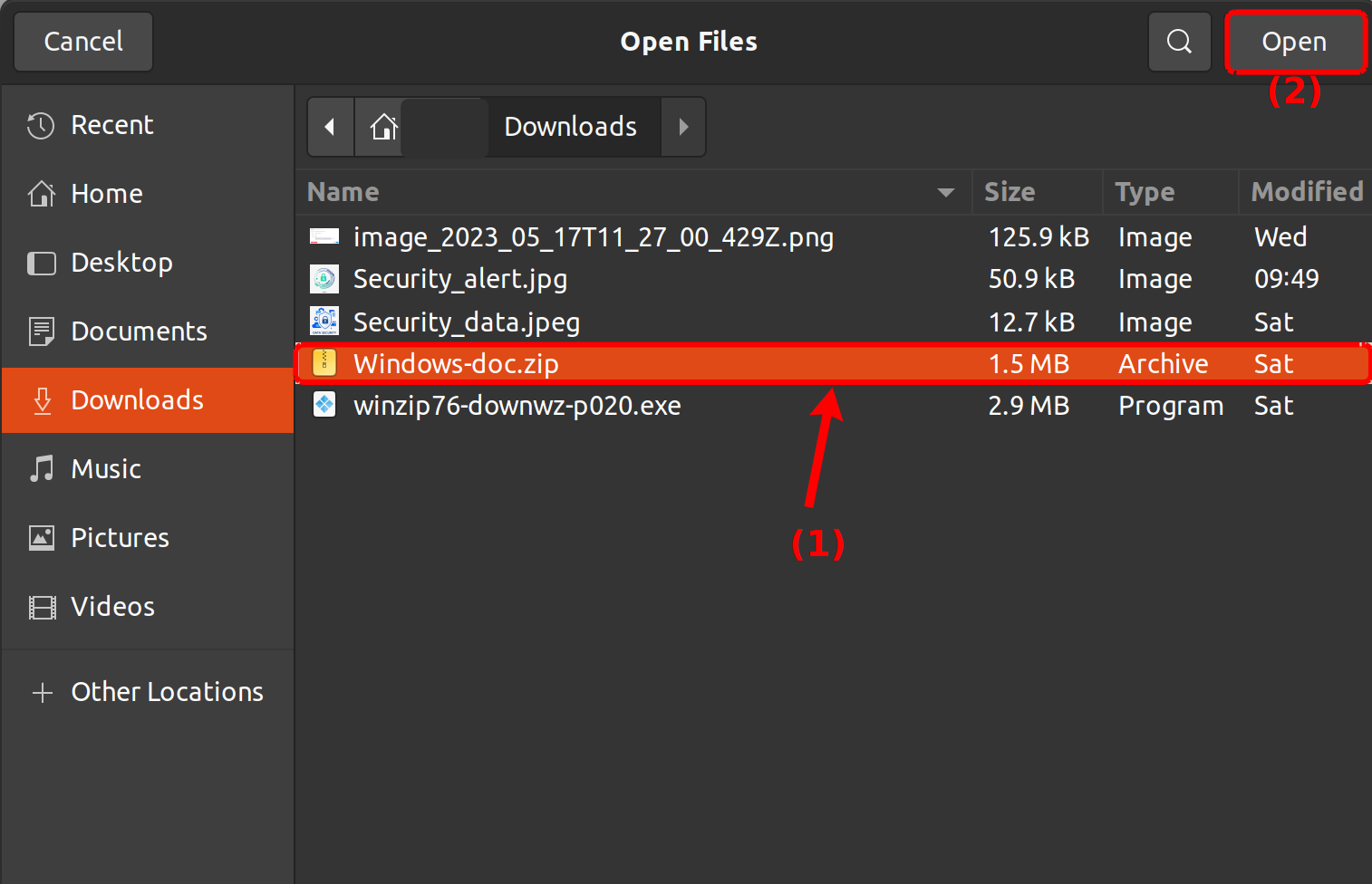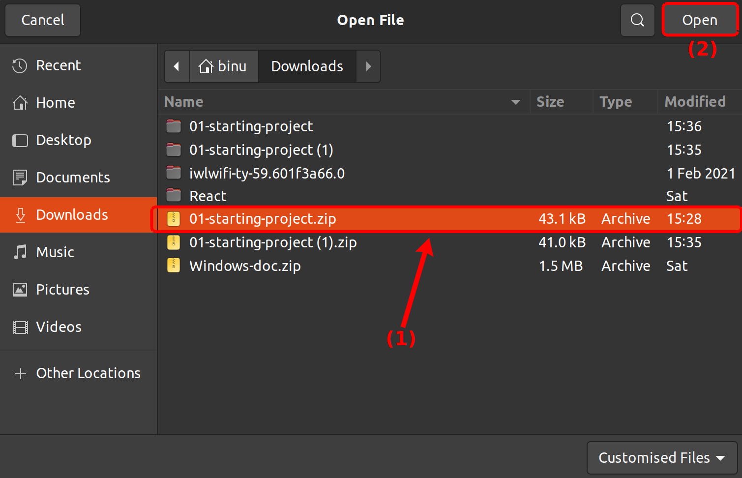 Click the title of the file you wish to import [1] and click the Open button [2] to upload the .zip file.
