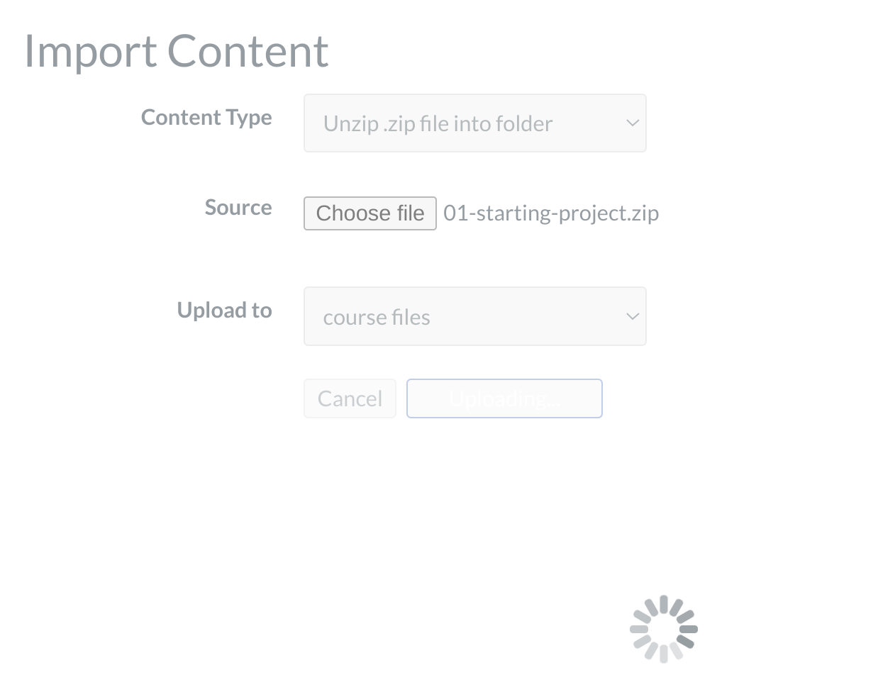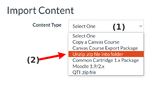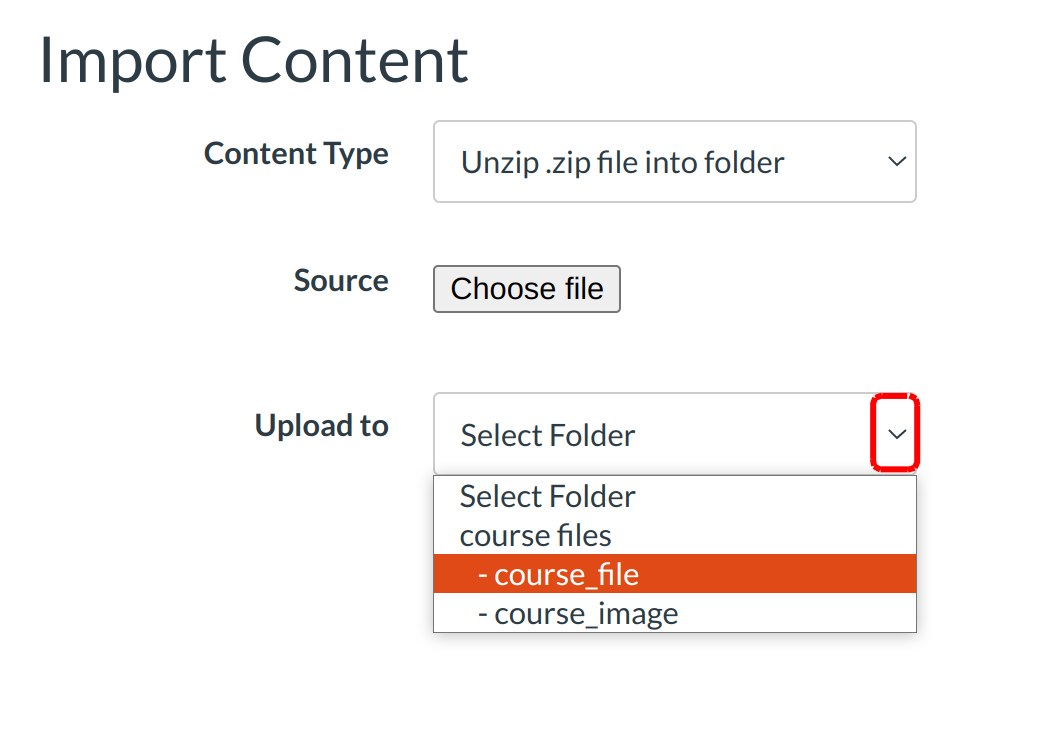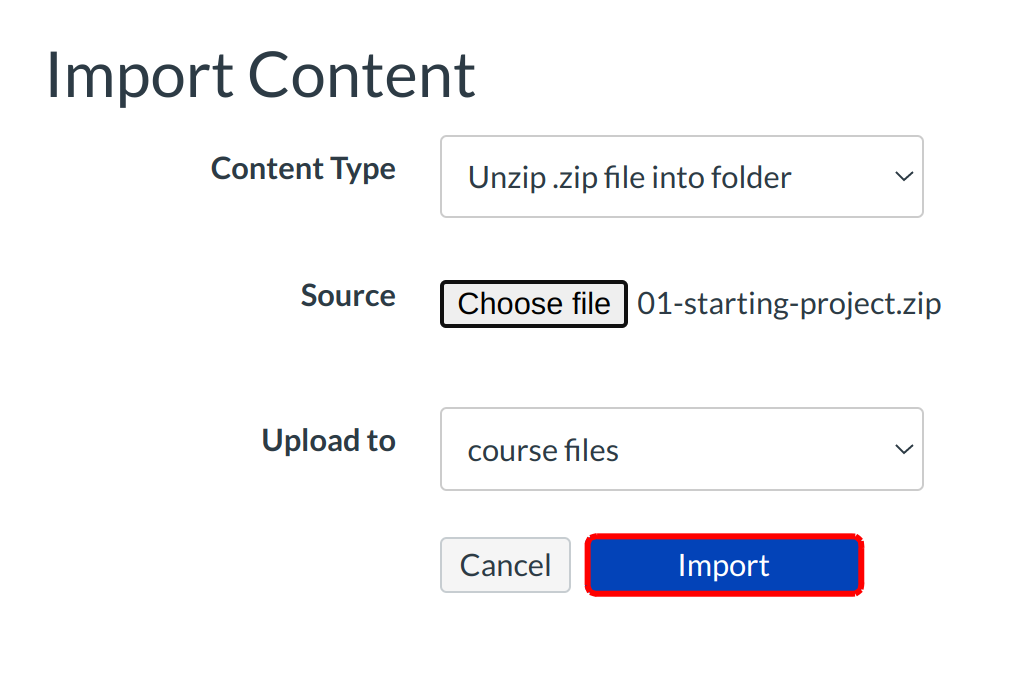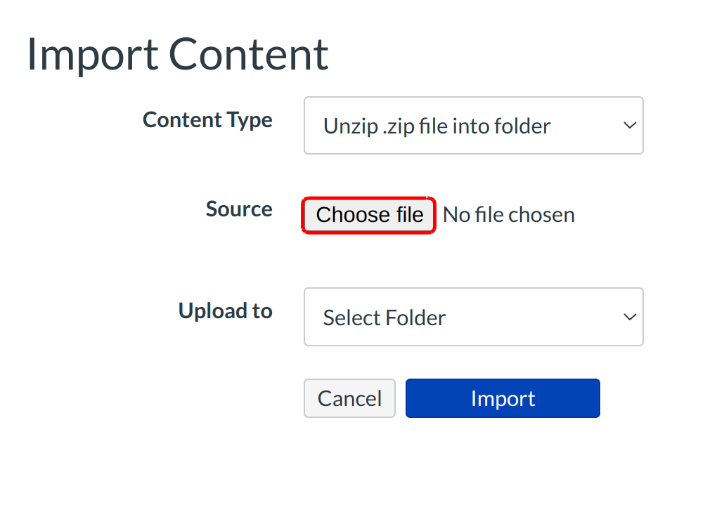 Note: Through this option, you must upload the .zip file to an existing folder in Files. You cannot create new folders through the Course Import Tool.