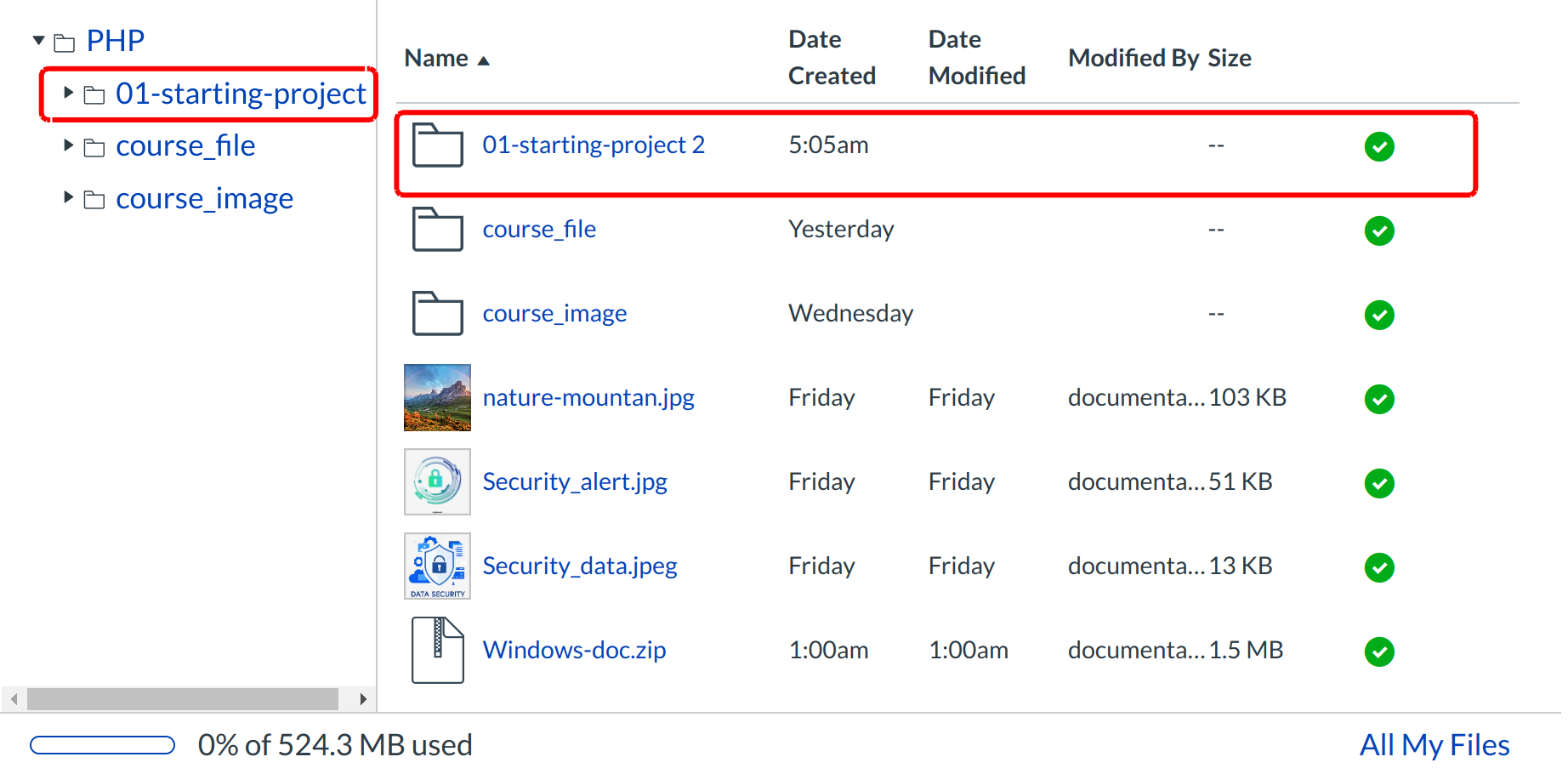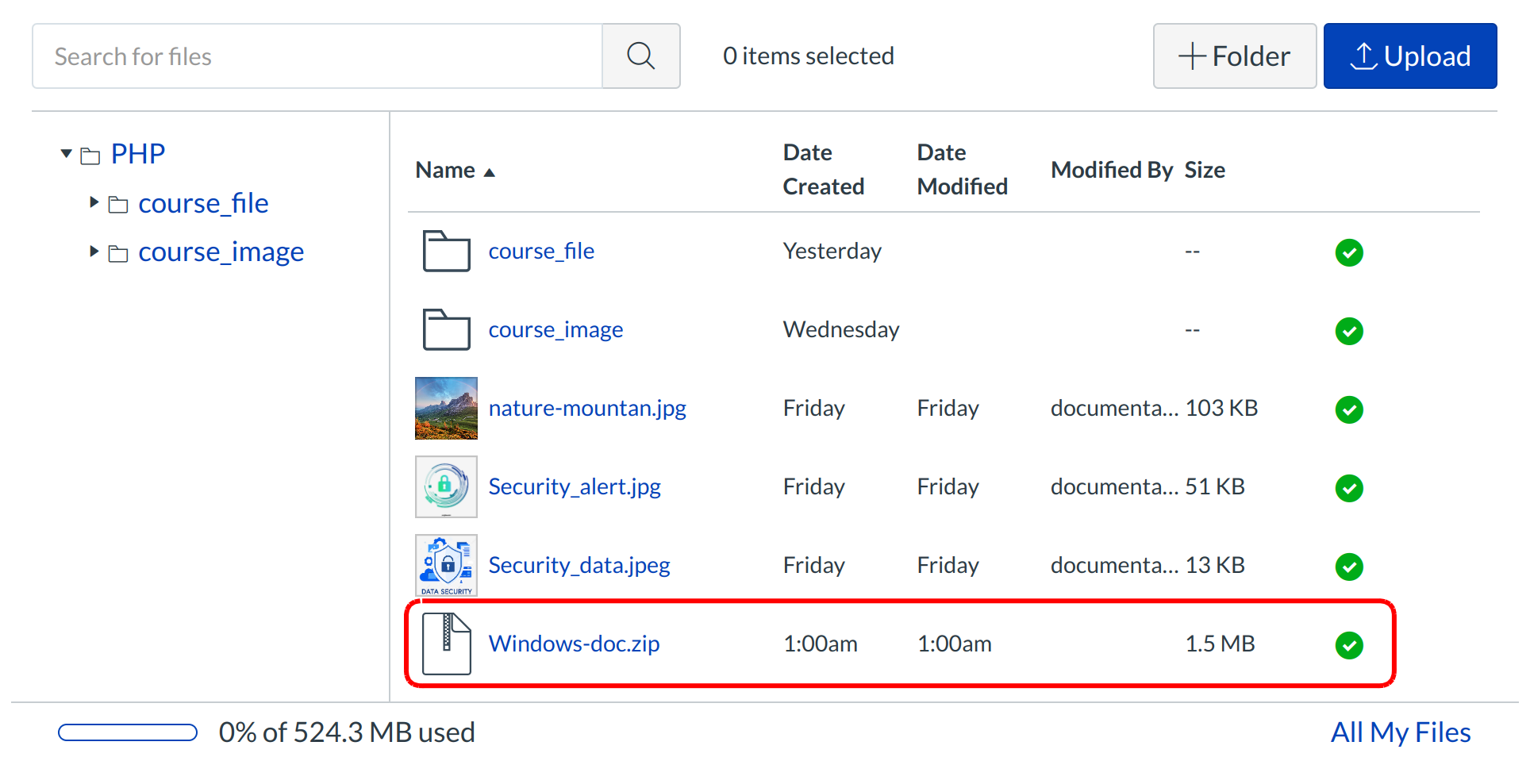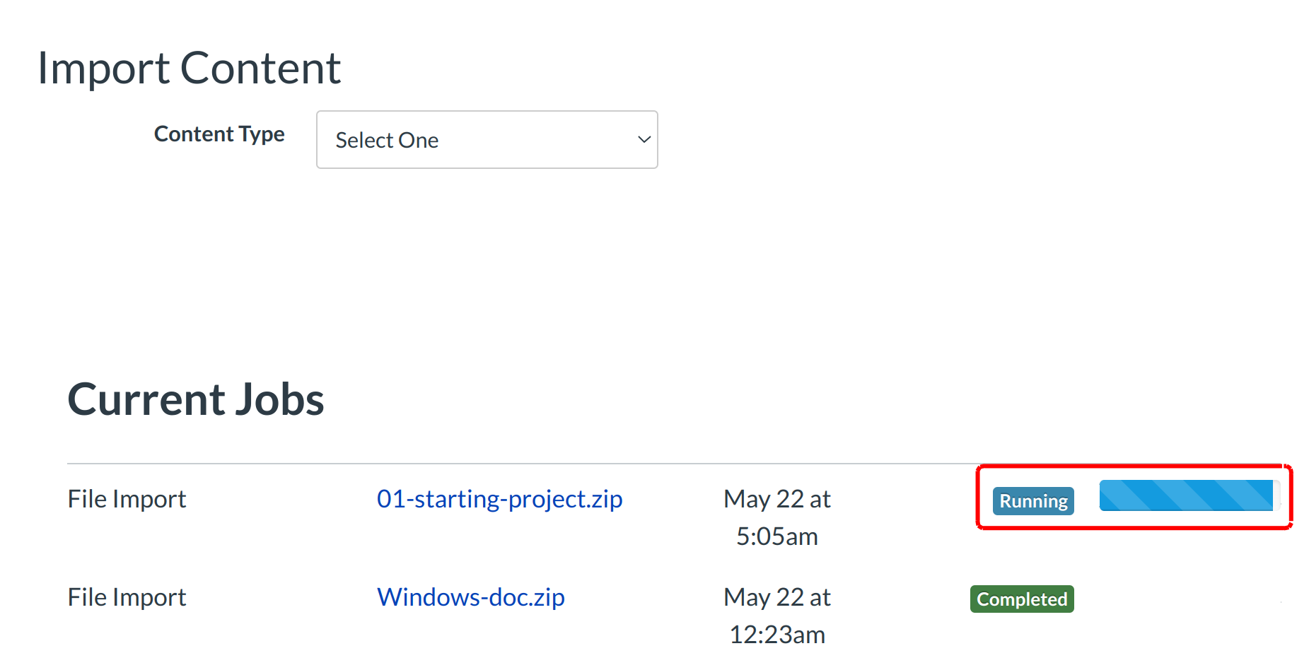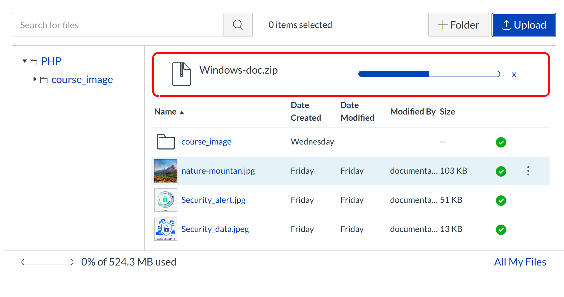 Note: Through this option, you must upload the .zip file to an existing folder in Files. You cannot create new folders through the Course Import Tool.