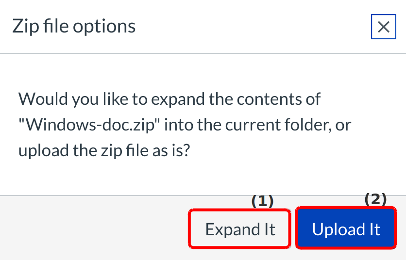 You can select which type of files should be uploaded by clicking the Expand It or Upload It menu. By selecting the Expand It option [1] the selected file has uploaded at unzip file and by clicking the Upload It option [2] the file will upload as .zip file.