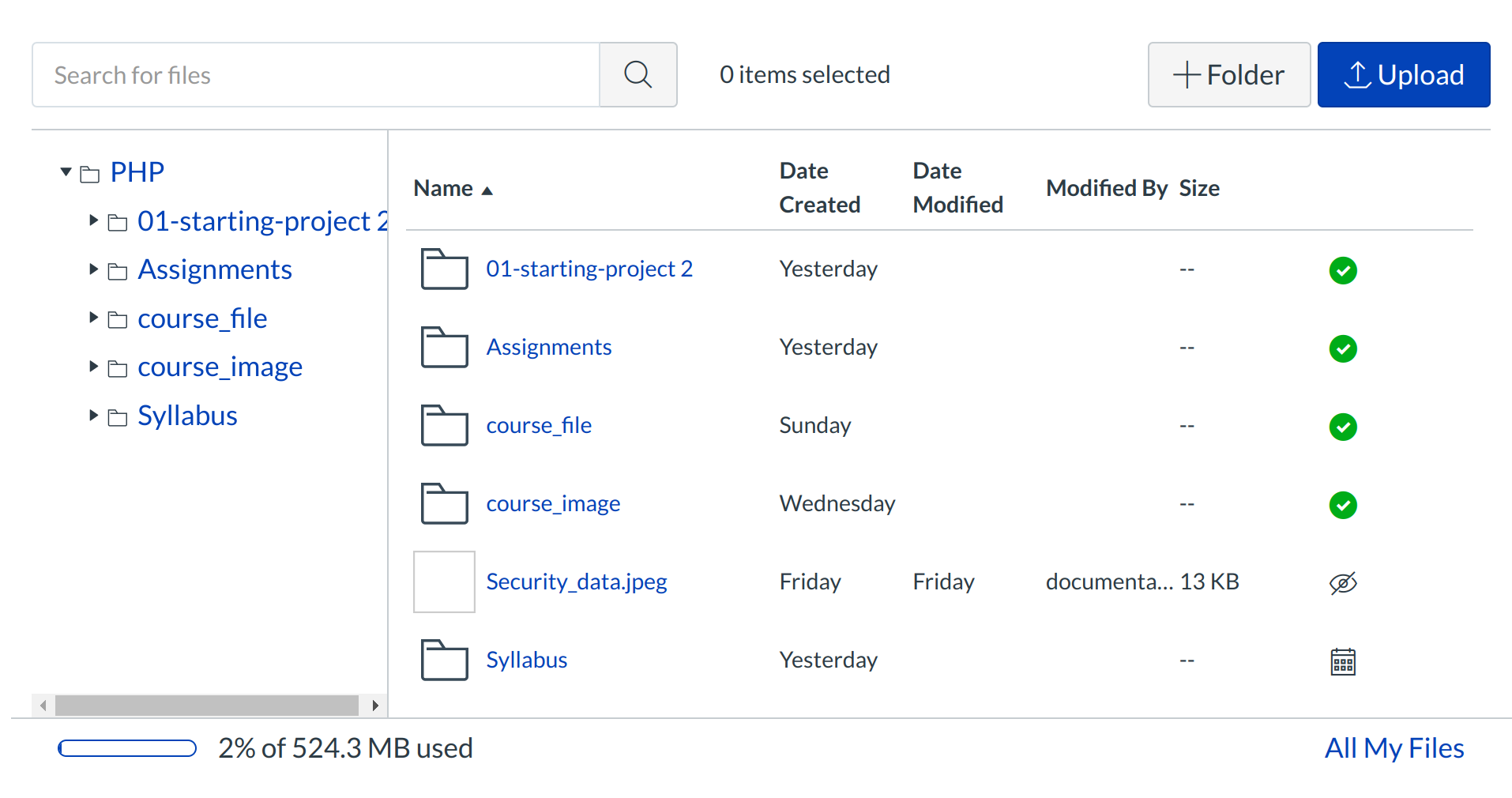 Within the Files tool, users can rename, delete, organize, and upload files. There are no file type or size limitations, but be aware of the amount of file storage available to you as set by the institution. Users can also upload a .zip file or download entire directories as .zip files.